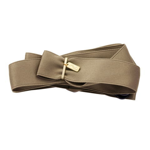 アシンメトリーに重ねたリボンに、揺れるゴールドプレートがアクセントを加えるバナナクリップ。