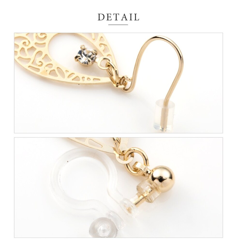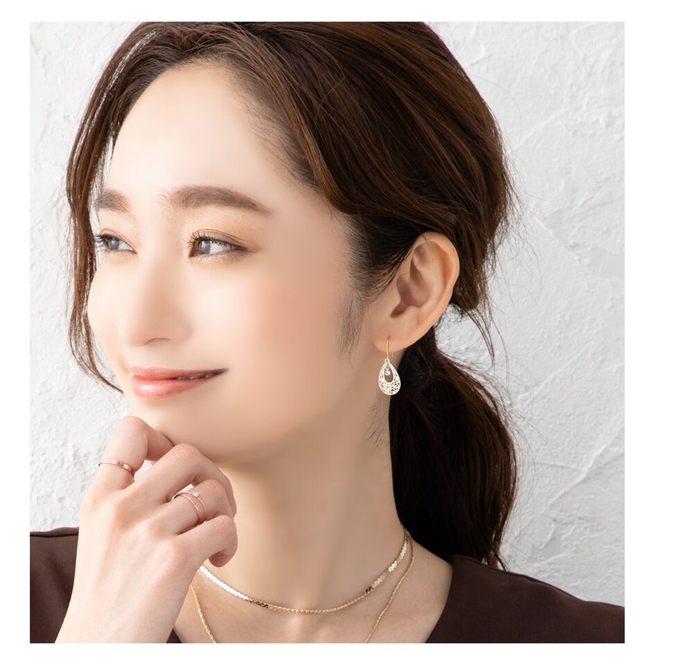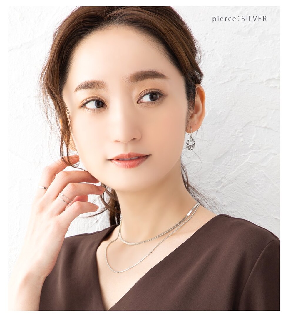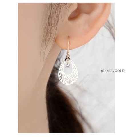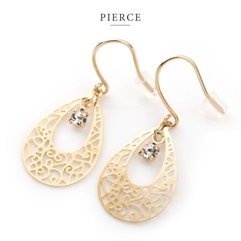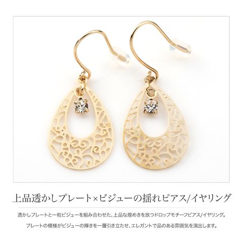 透かしプレートと一粒ビジューを組み合わせた、上品な煌めきを放つドロップモチーフピアス/イヤリング。