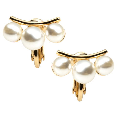 大きさの異なる3つの艶めくパール・煌めくビジューを連ねたスタッドピアス/イヤリング。