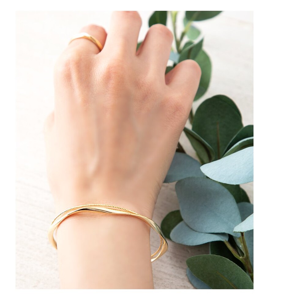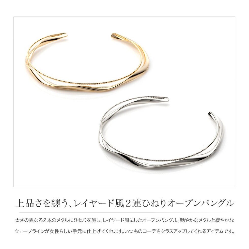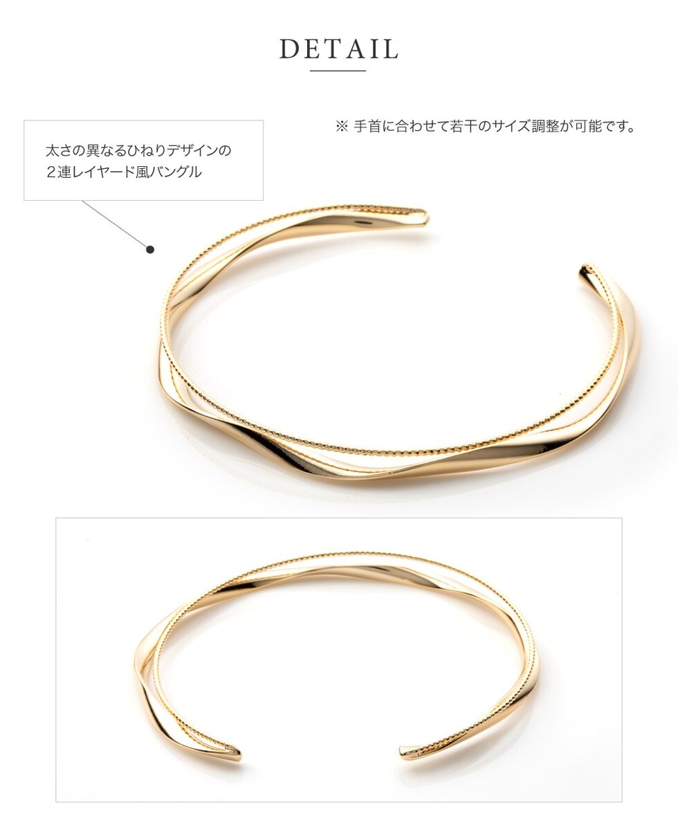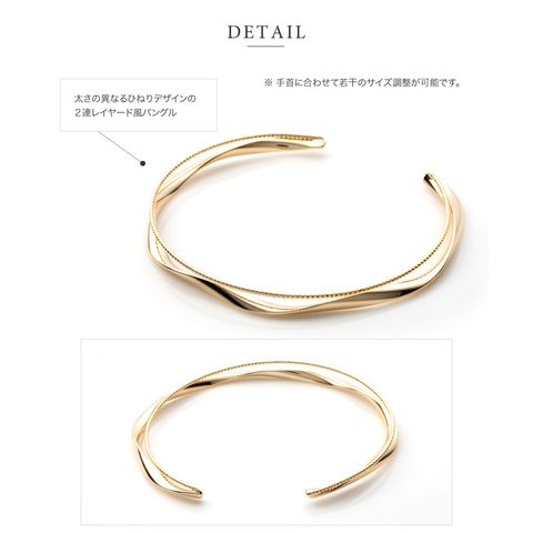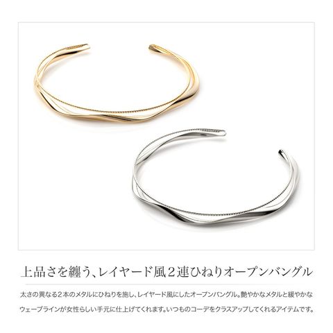 太さの異なる2本のメタルにひねりを施し、レイヤード風にしたオープンバングル。