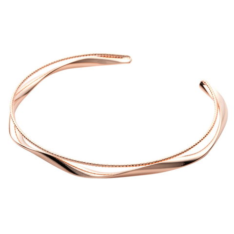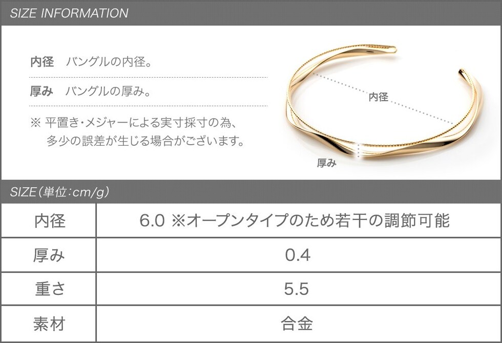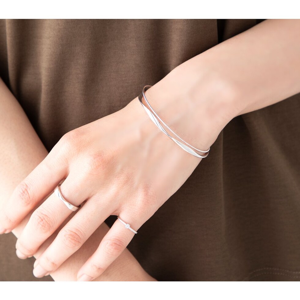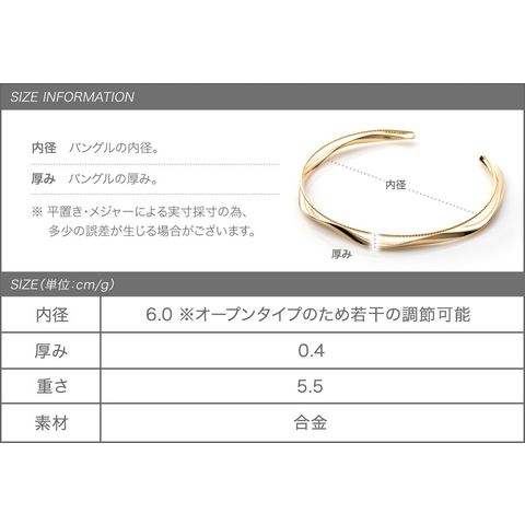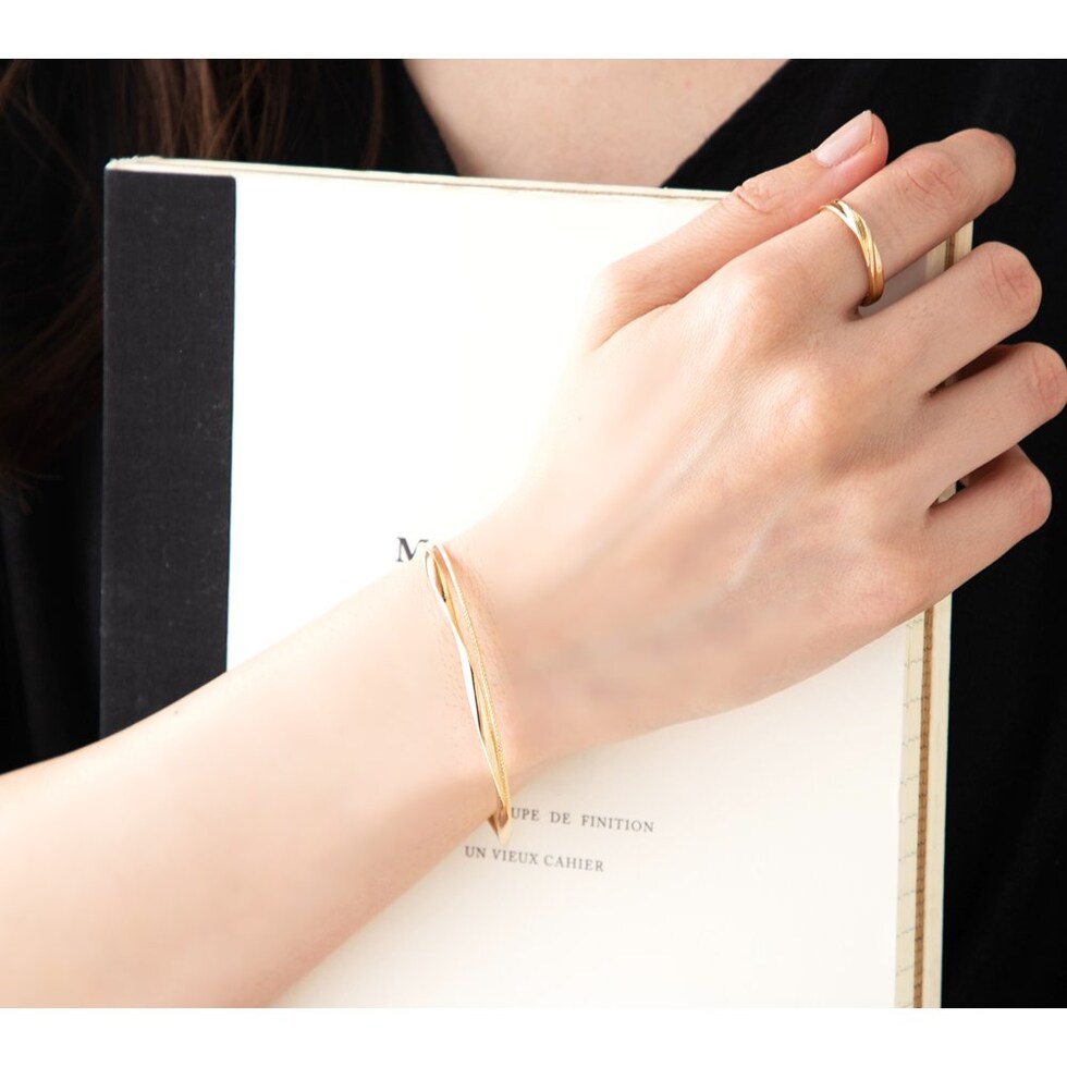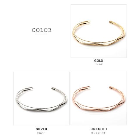 太さの異なる2本のメタルにひねりを施し、レイヤード風にしたオープンバングル。