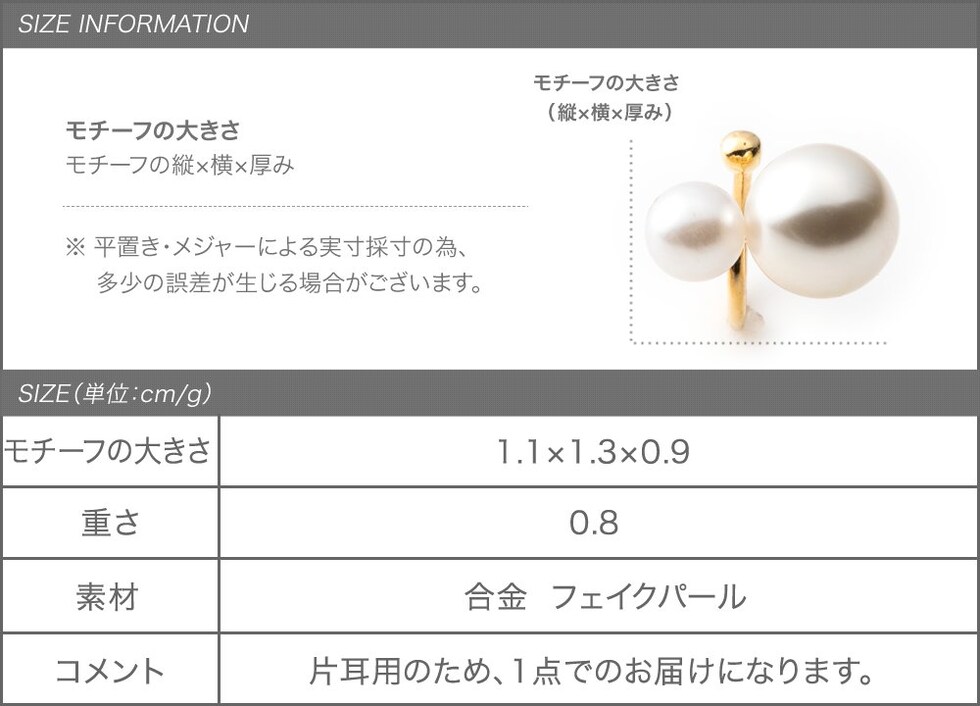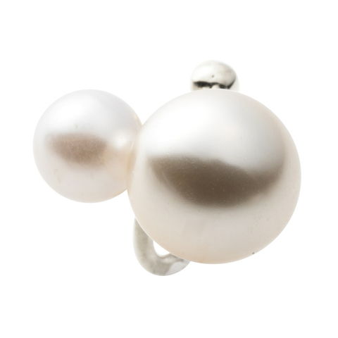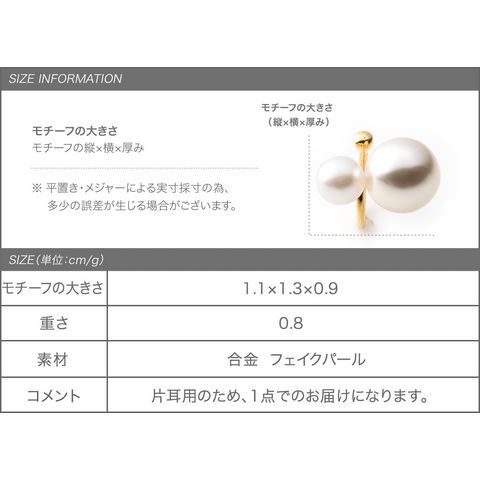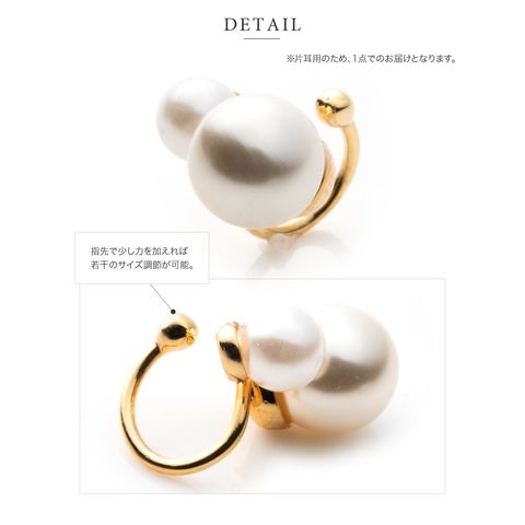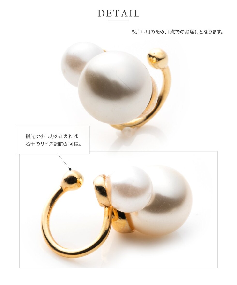 サイズの異なる2粒のパールを並べた片耳用イヤーカフ。