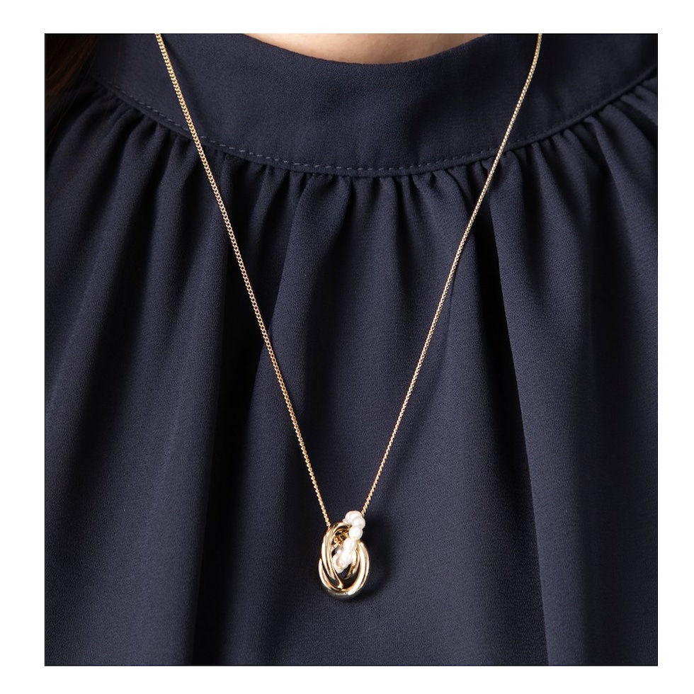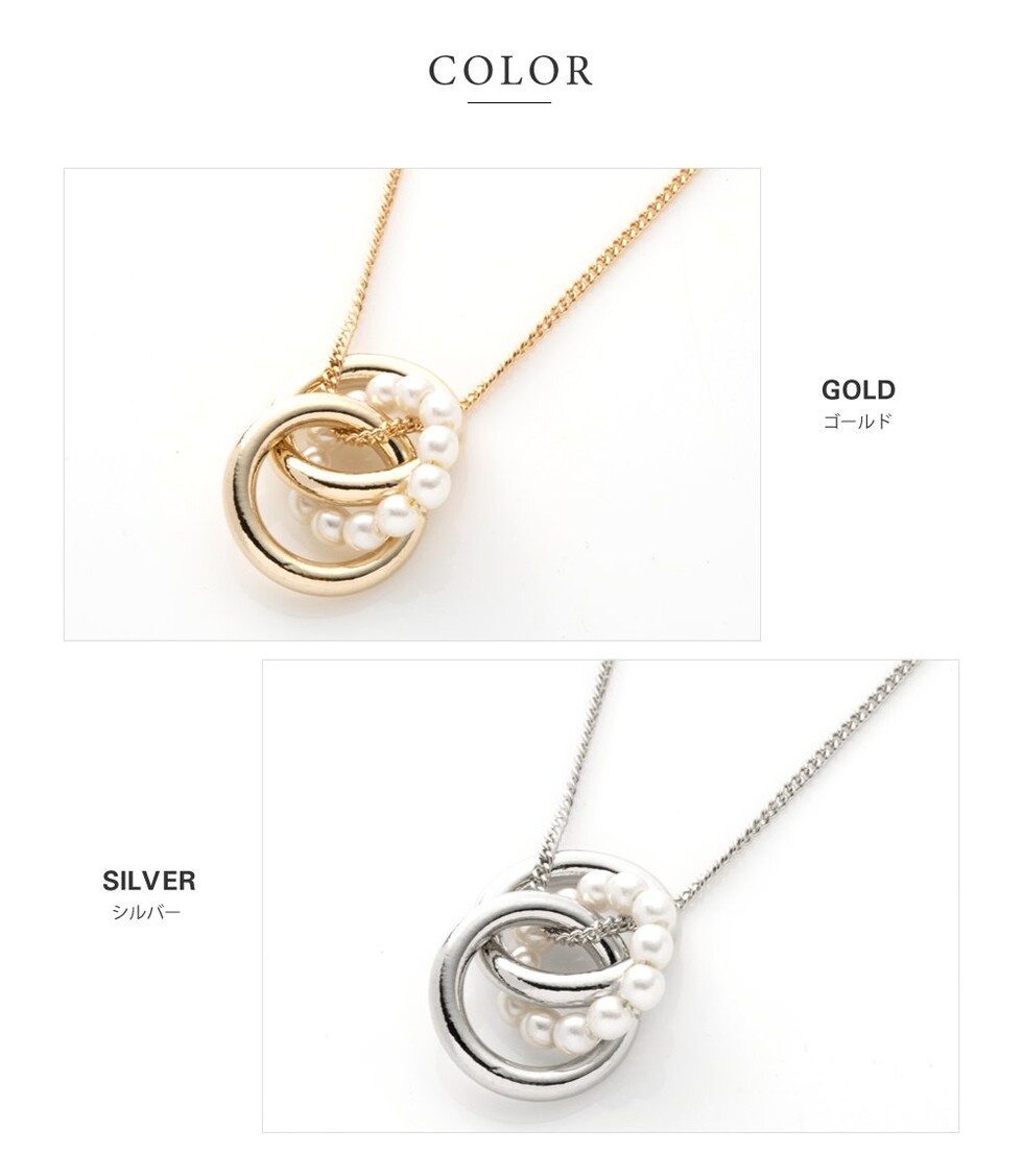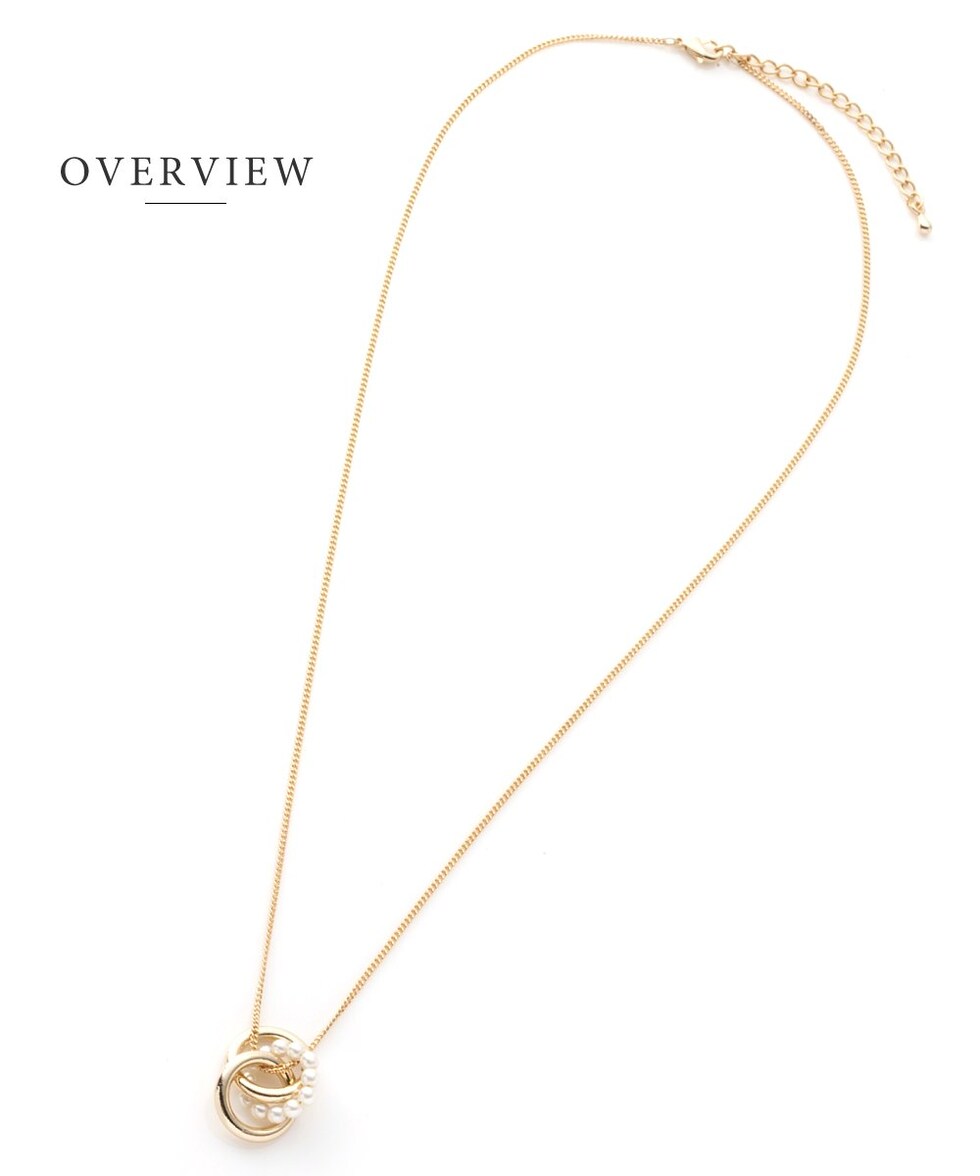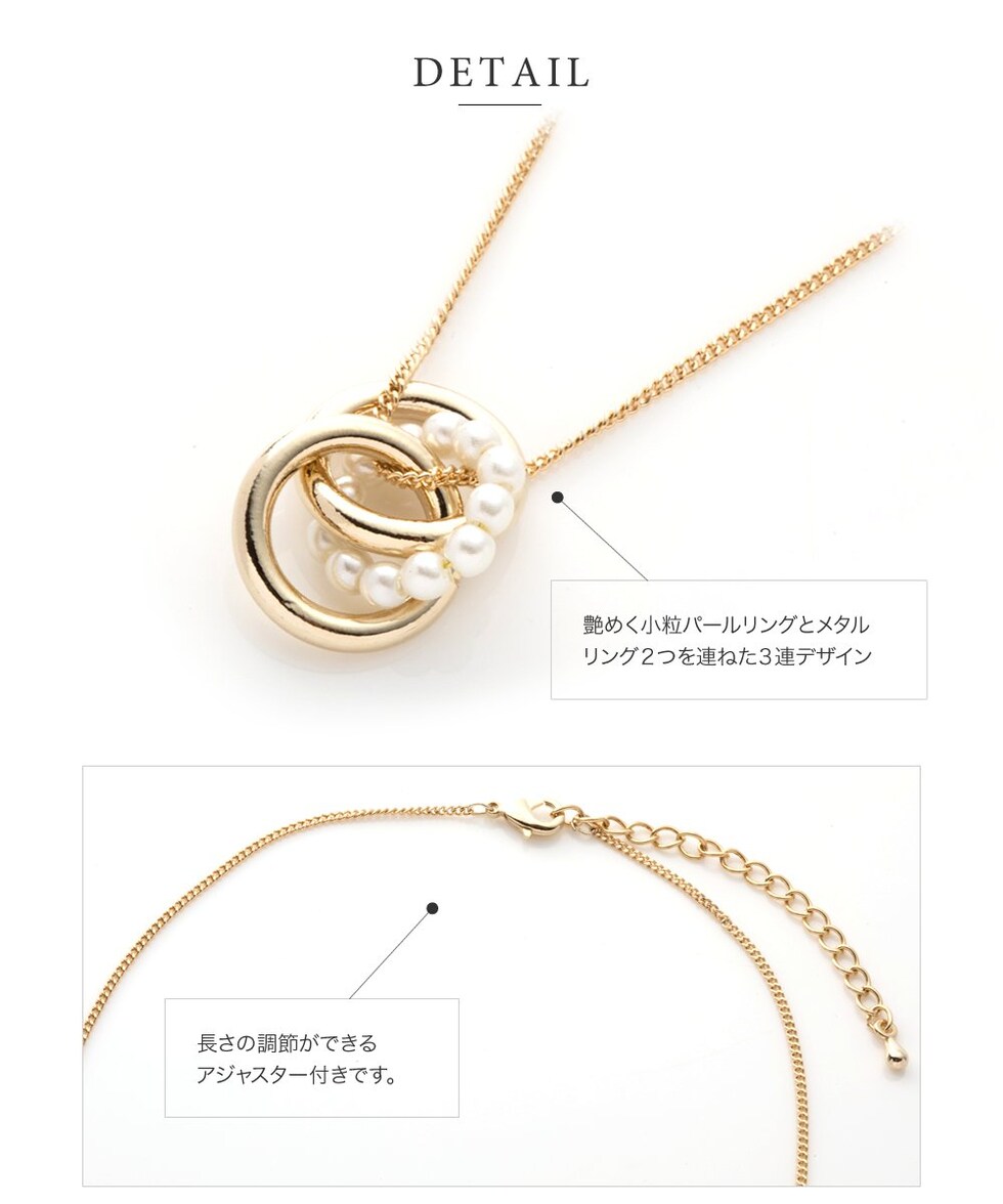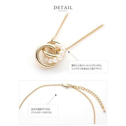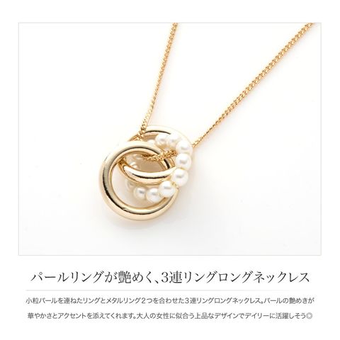 小粒パールを連ねたリングとメタルリング2つを合わせた3連リングロングネックレス。