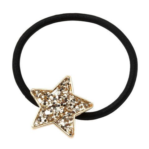 大きさの異なるラメが光を受けてきらめく星型モチーフのヘアゴム。