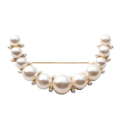 大きさの異なるパールをクレッセント型に連ね、結合部分に極小パールを配したブローチ。