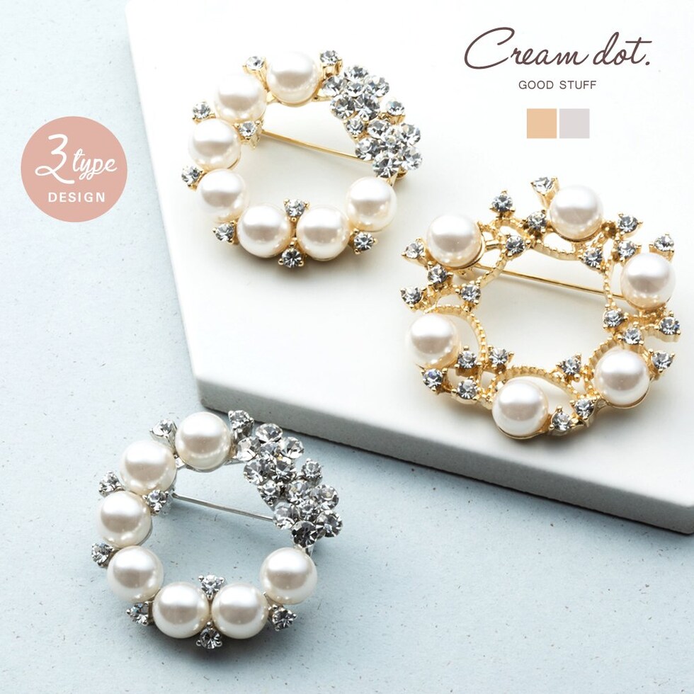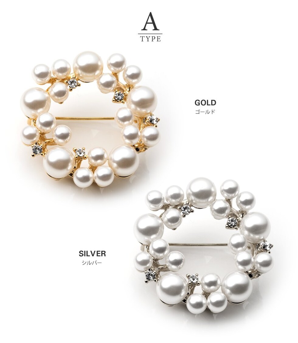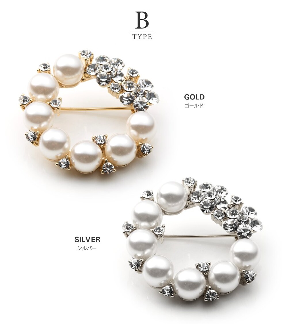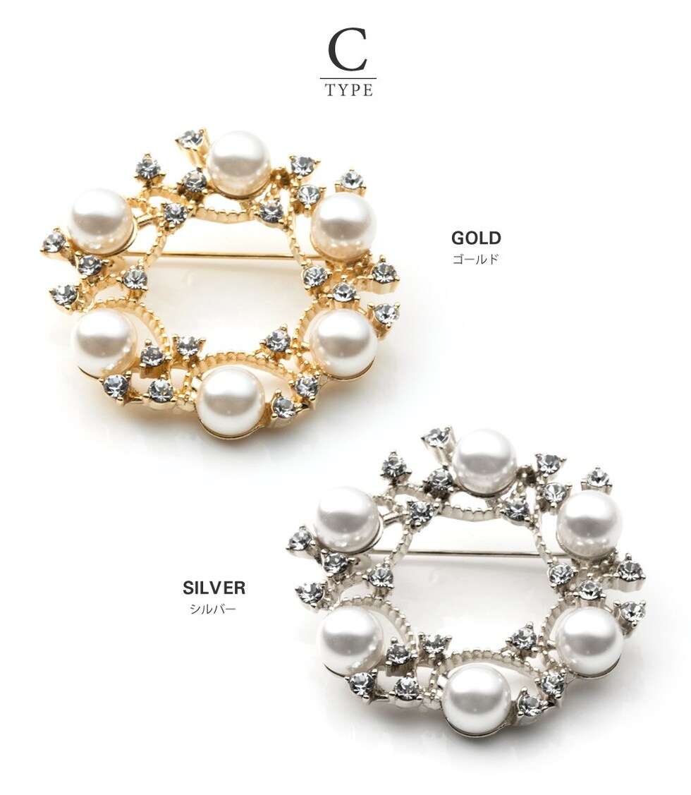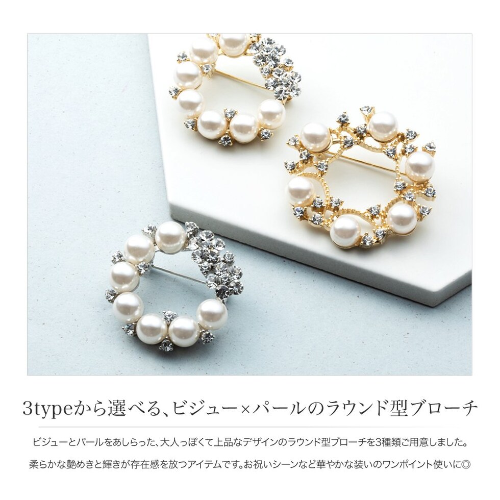ビジューとパールをあしらった、大人っぽくて上品なデザインのラウンド型ブローチを3種類ご用意しました。