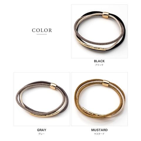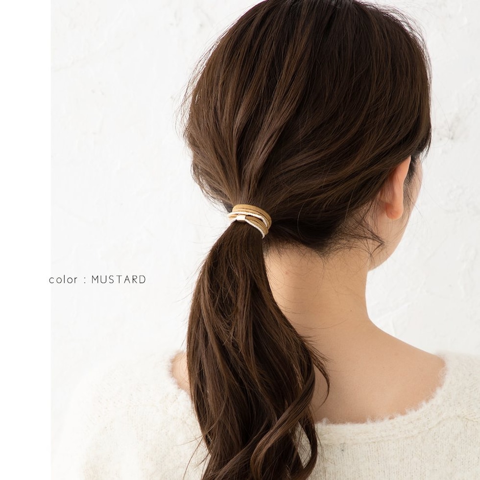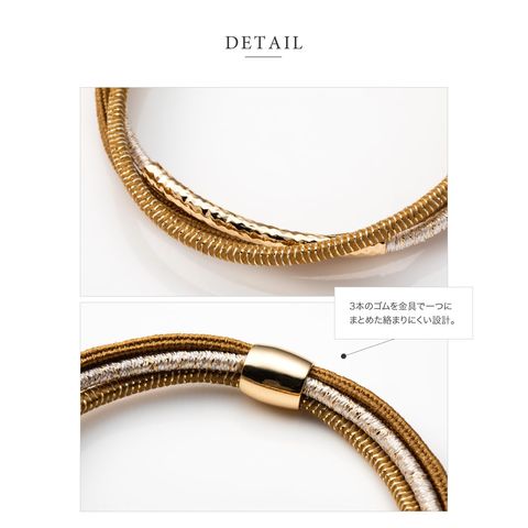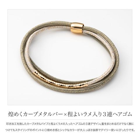 叩き加工を施したカーブメタルパイプと程よくラメの入ったヘアゴムの3連デザイン。