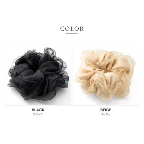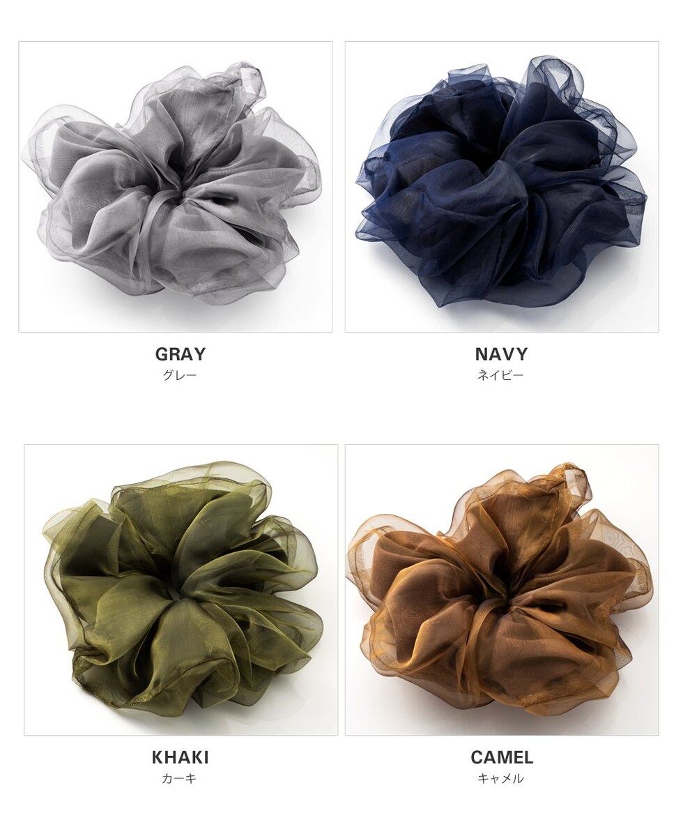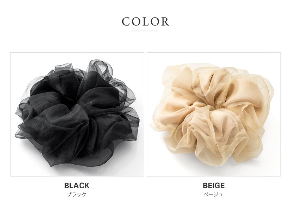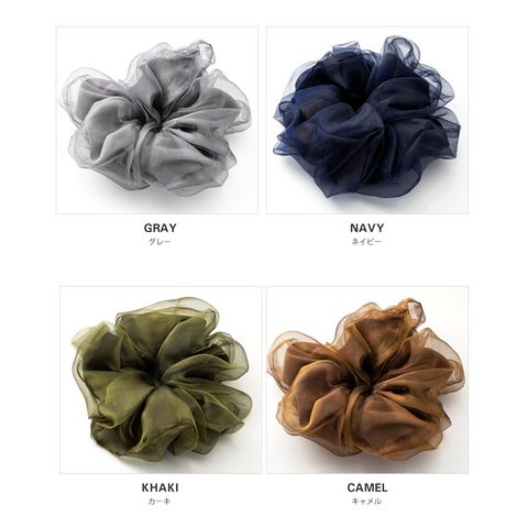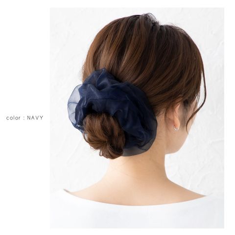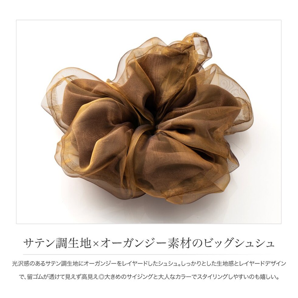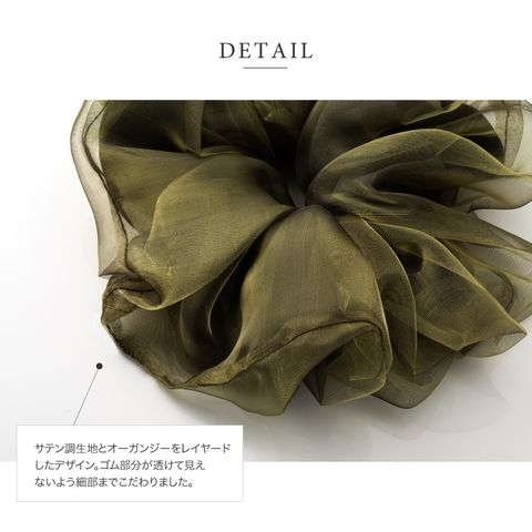 光沢感のあるサテン調生地にオーガンジーをレイヤードしたシュシュ。