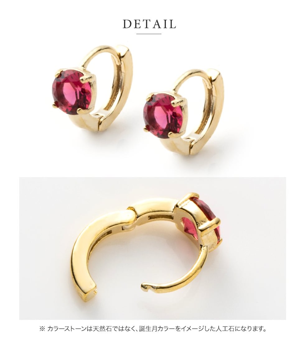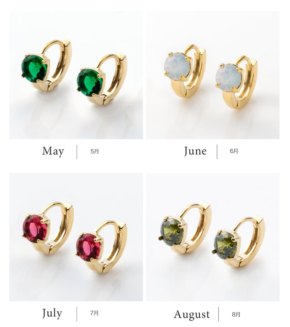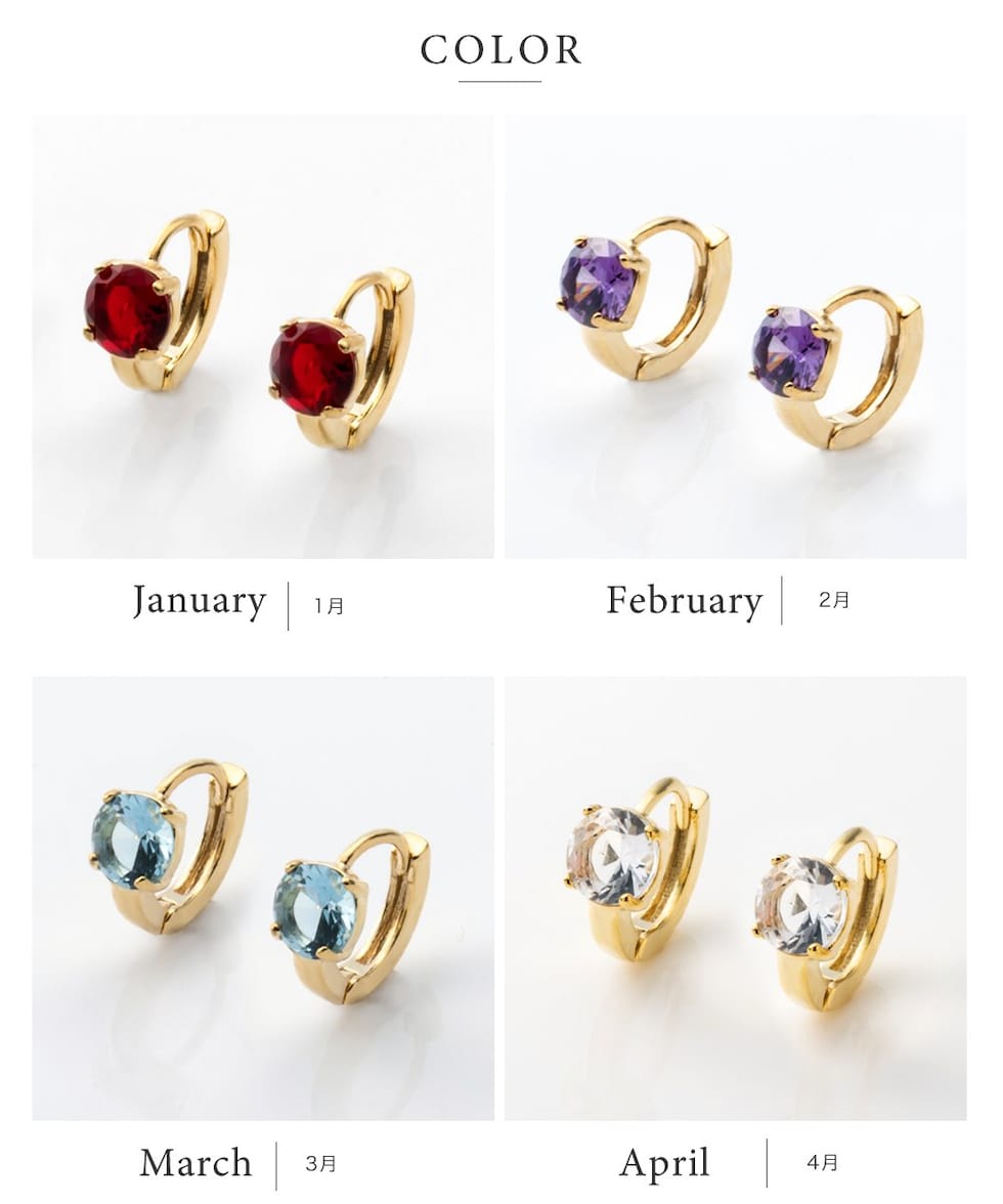 誕生月をイメージした一粒のキュービックジルコニアを飾ったシンプルなキャッチレスフープピアス。4本の爪がビジューの輝きを一層引き立てる高見えアイテムです。全12色展開で、ちょっとした贈り物にも◎