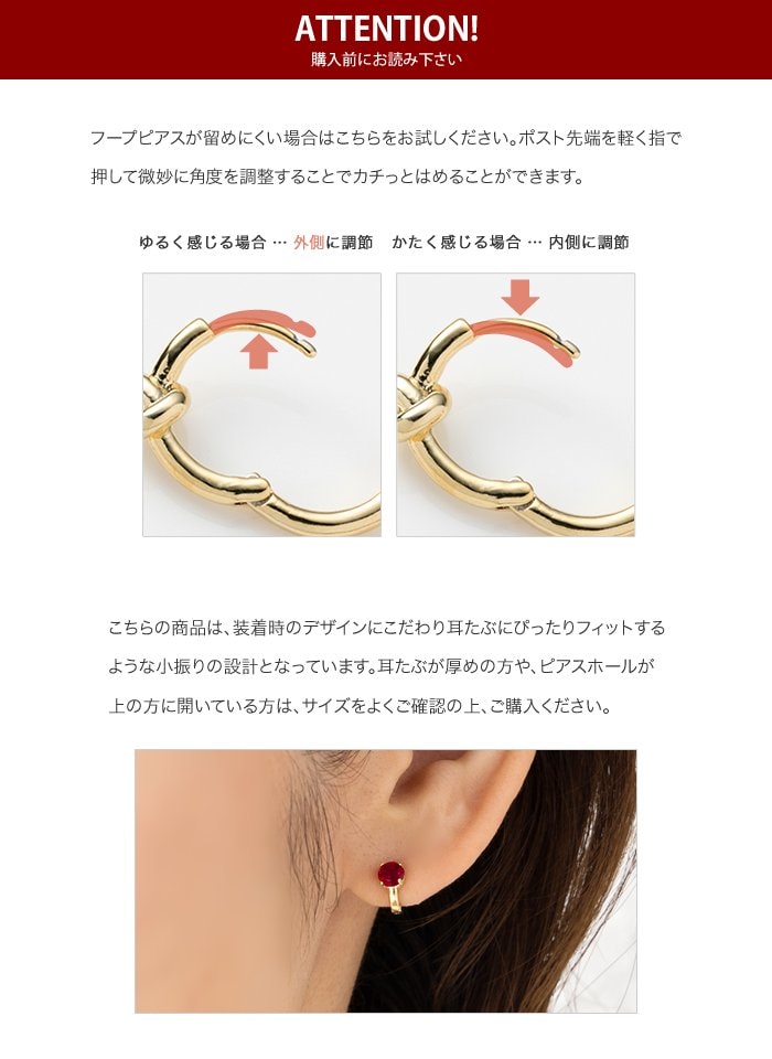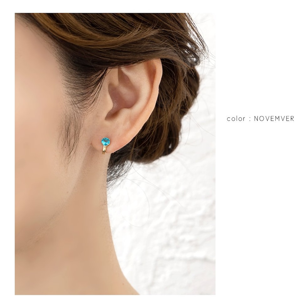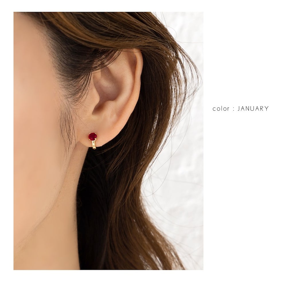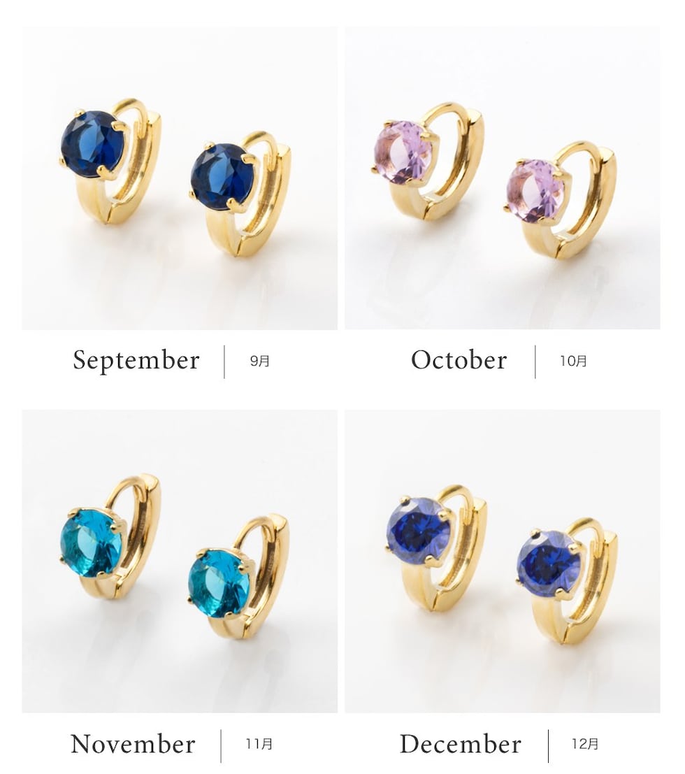 誕生月をイメージした一粒のキュービックジルコニアを飾ったシンプルなキャッチレスフープピアス。4本の爪がビジューの輝きを一層引き立てる高見えアイテムです。全12色展開で、ちょっとした贈り物にも◎
