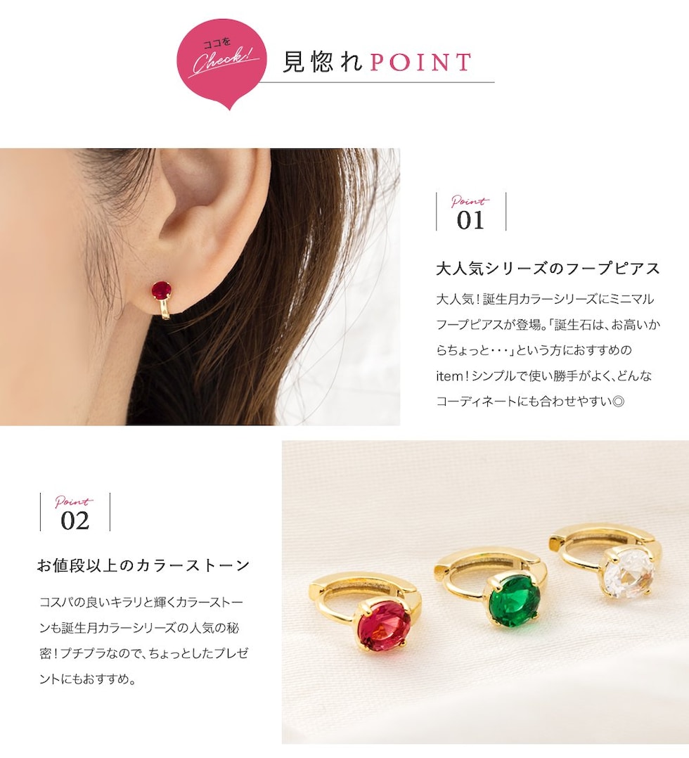 大人気!誕生月カラーシリーズにミニマルフープピアスが登場。「誕生石は、お高いからちょっと・・・」という方におすすめのitem!シンプルで使い勝手がよく、どんなコーディネートにも合わせやすい◎