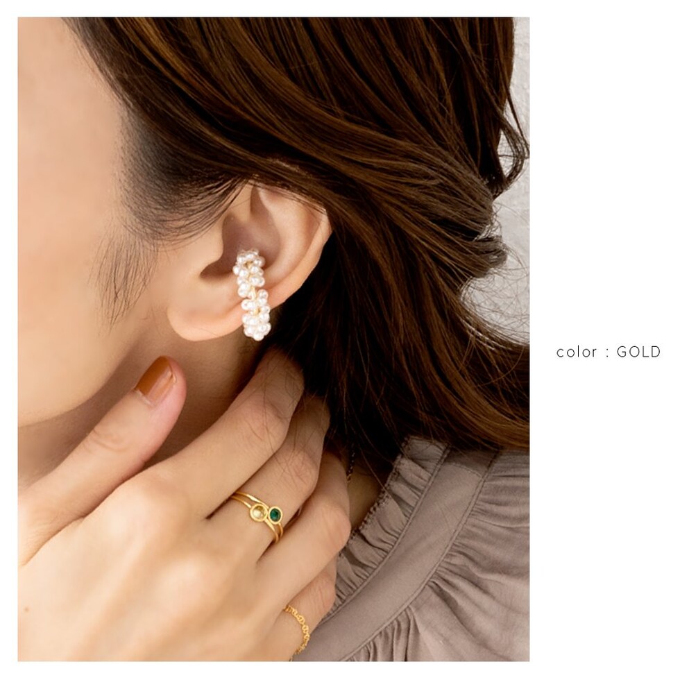 パールビーズを巻き着けたラグジュアリーな雰囲気の片耳用イヤーカフ。程よいボリューム感で耳元をパッと華やかに印象付けます。いつものコーデをより女性らしく演出してくれるひと品です。