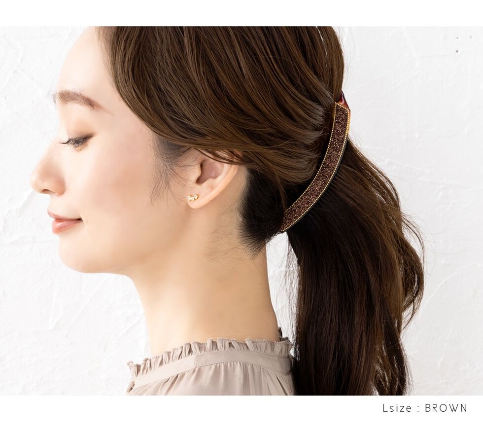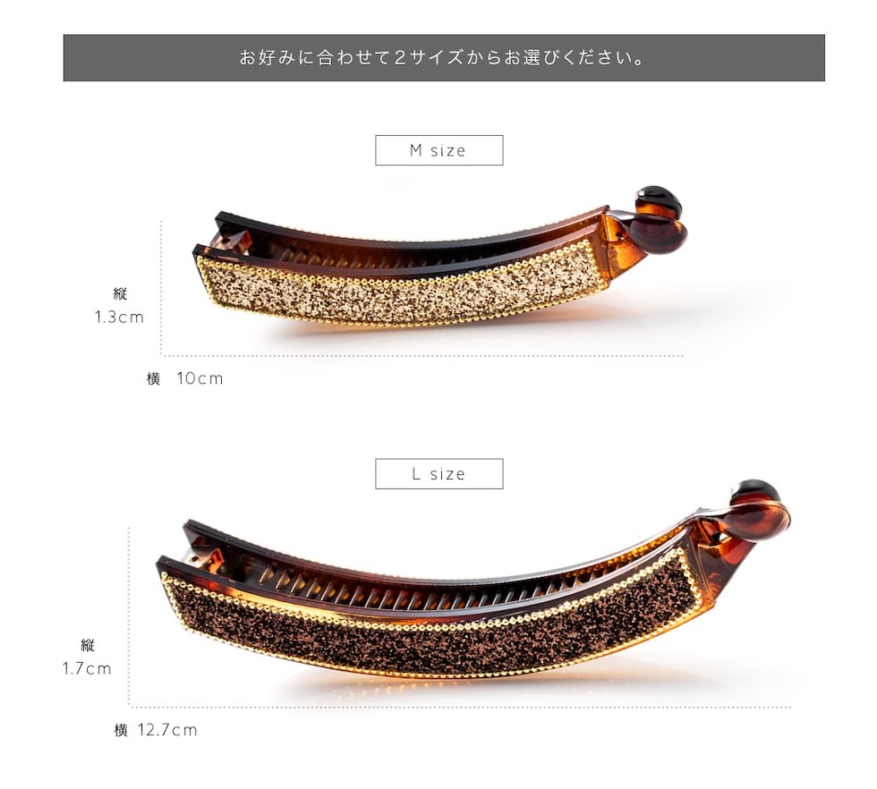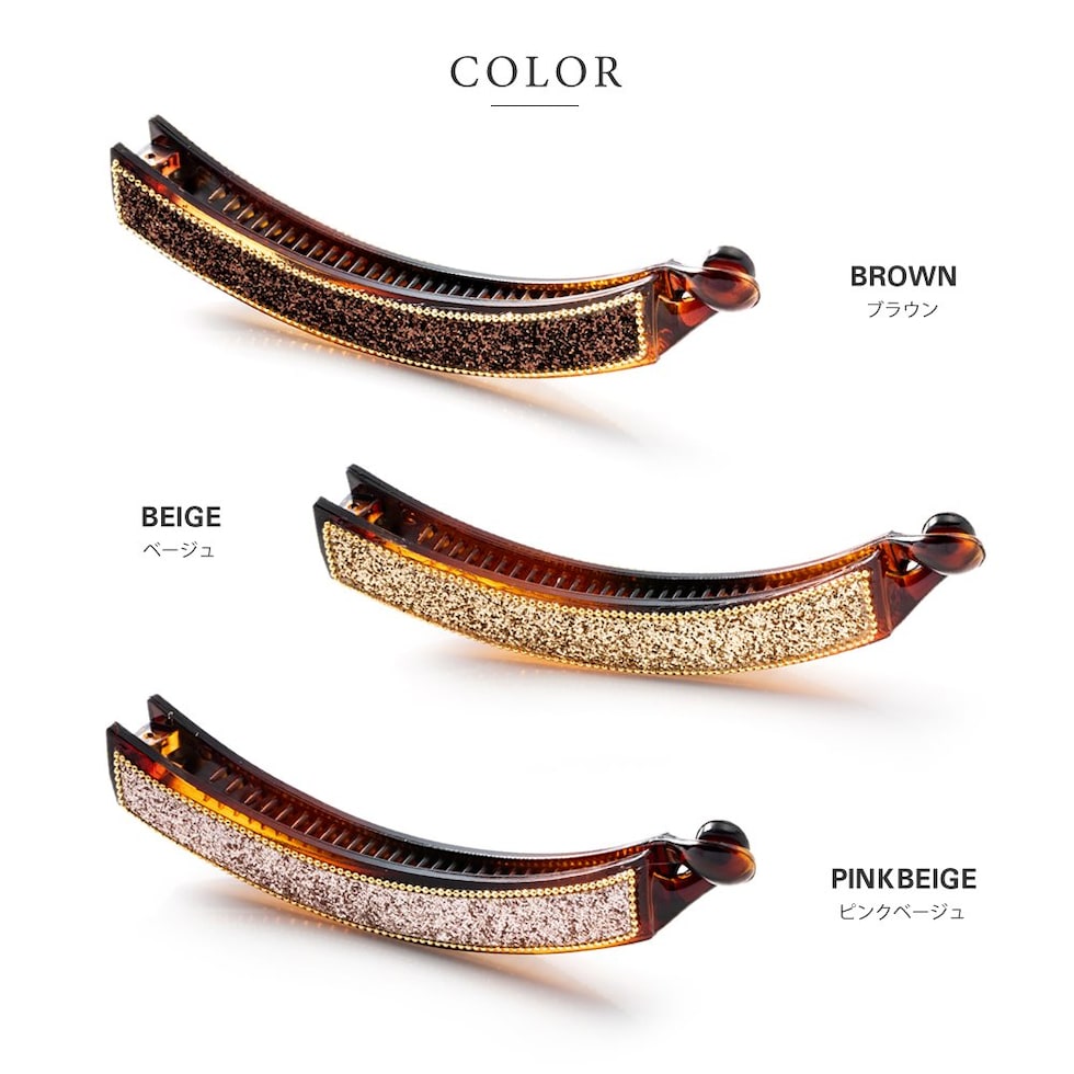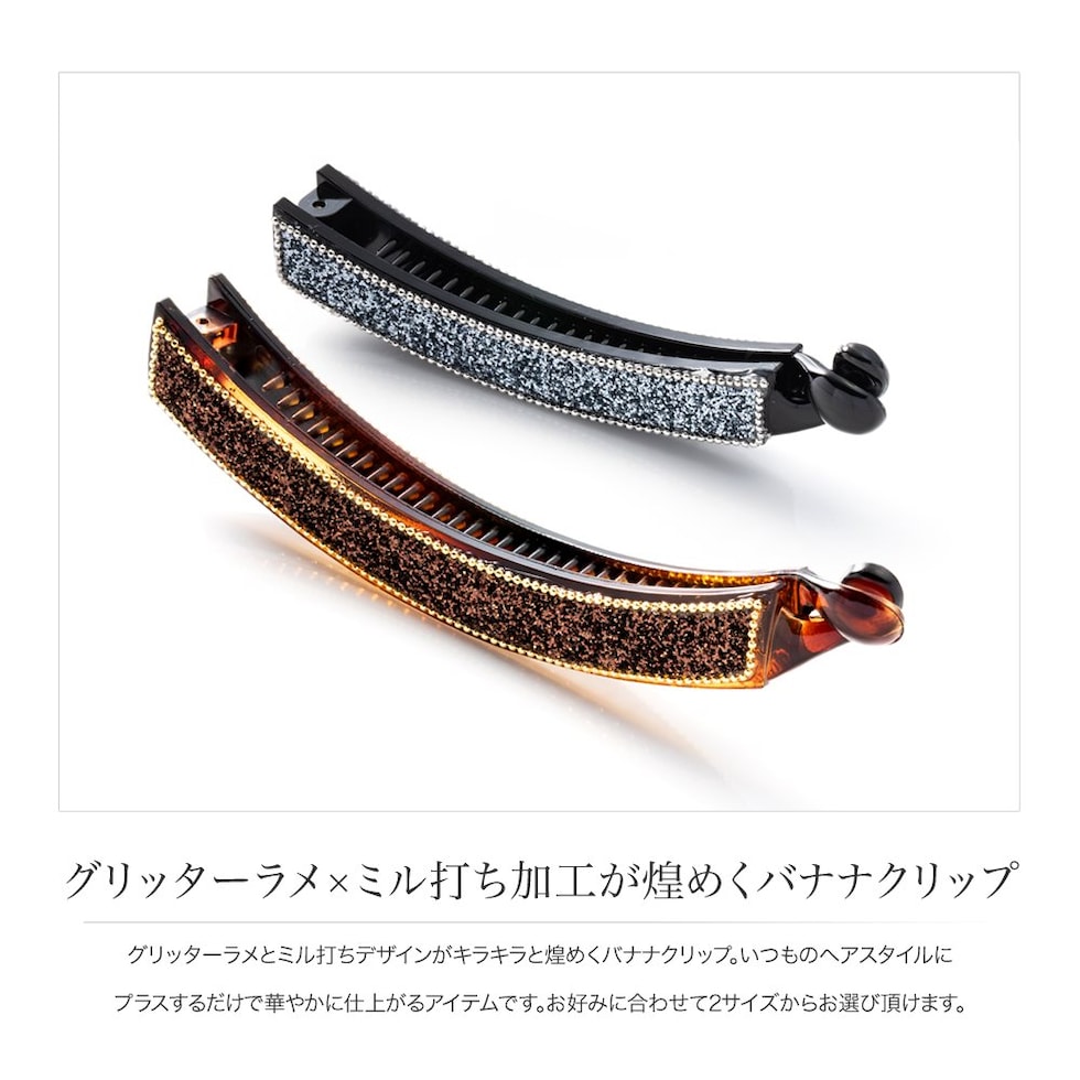 グリッターラメとミル打ちデザインがキラキラと煌めくバナナクリップ。いつものヘアスタイルにプラスするだけで華やかに仕上がるアイテムです。お好みに合わせて2サイズからお選び頂けます。