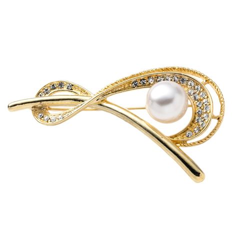パールやビジューを贅沢に飾ったブローチ。緩やかな曲線が大人っぽい上品デザインでジャケットやドレスに合わせやすいアイテムです。お祝いシーンなど華やかな装いのワンポイント使いにオススメ。