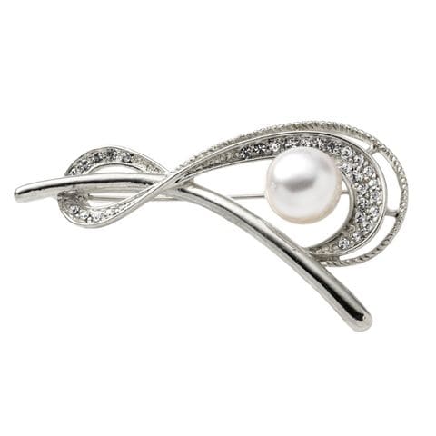 パールやビジューを贅沢に飾ったブローチ。緩やかな曲線が大人っぽい上品デザインでジャケットやドレスに合わせやすいアイテムです。お祝いシーンなど華やかな装いのワンポイント使いにオススメ。