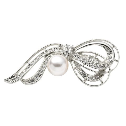 パールやビジューを贅沢に飾ったブローチ。緩やかな曲線が大人っぽい上品デザインでジャケットやドレスに合わせやすいアイテムです。お祝いシーンなど華やかな装いのワンポイント使いにオススメ。