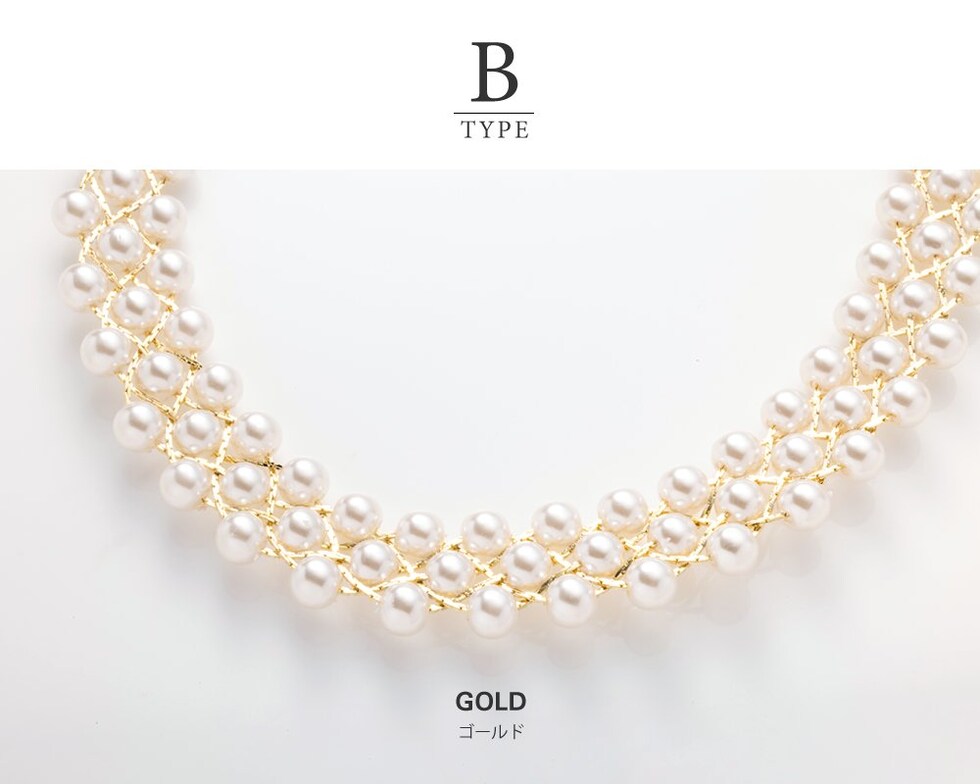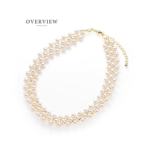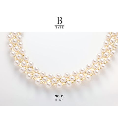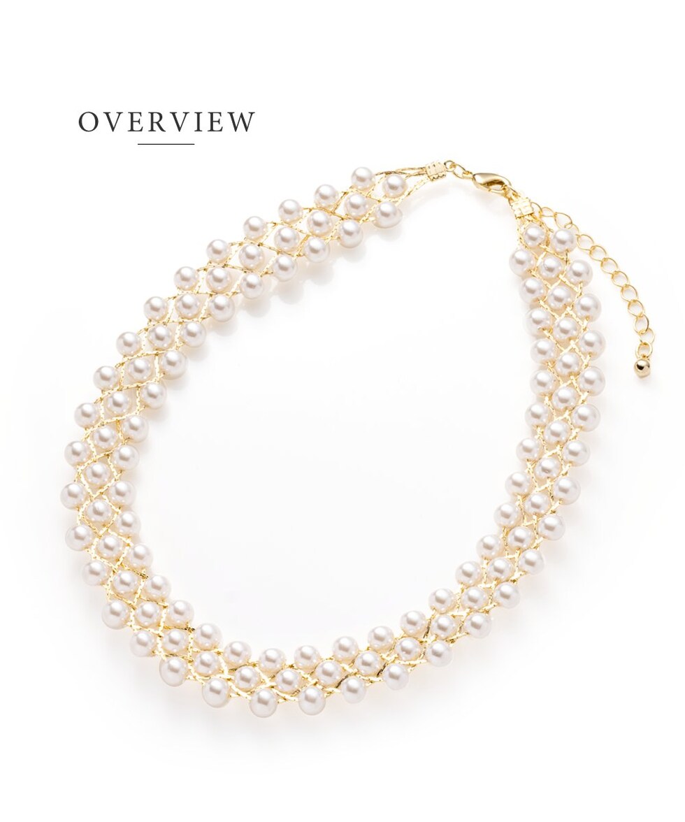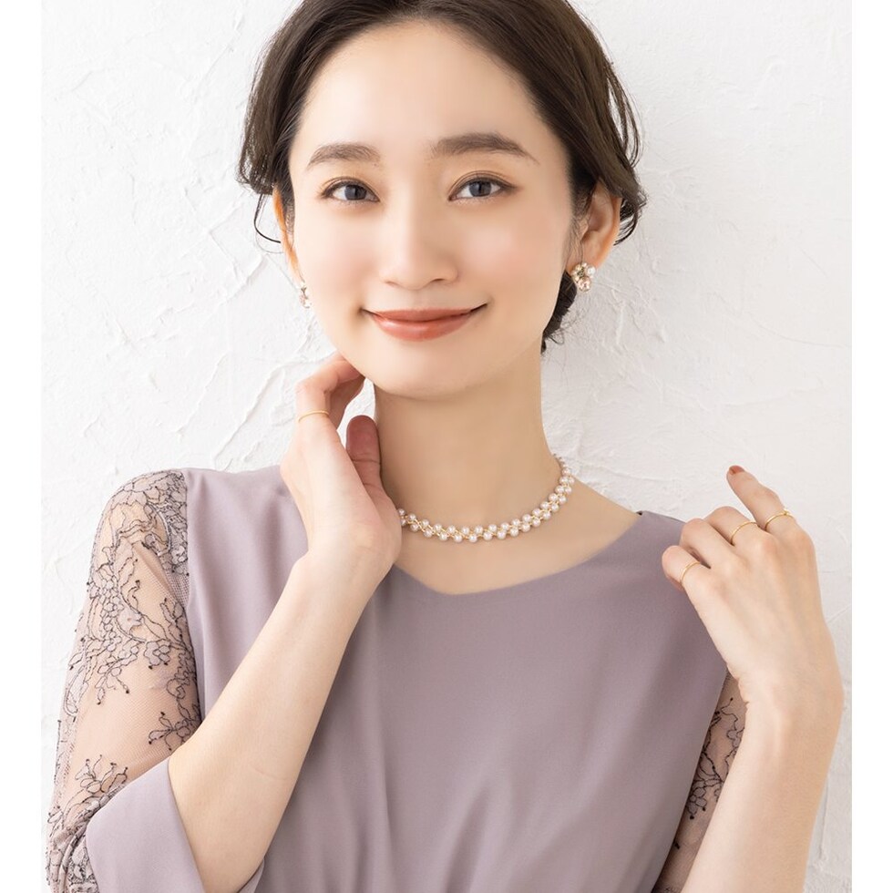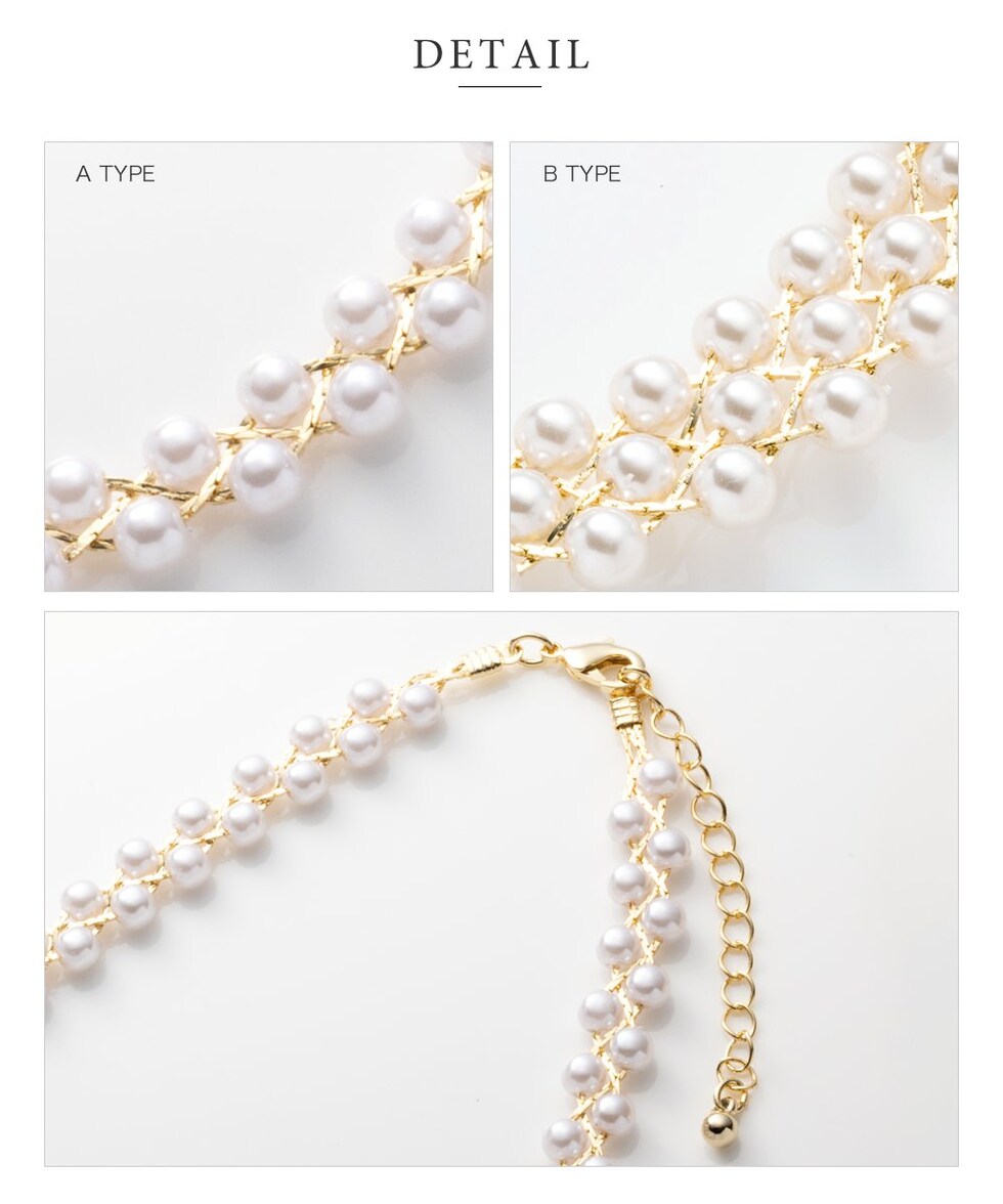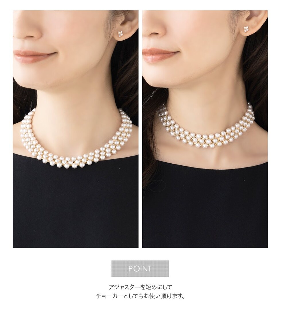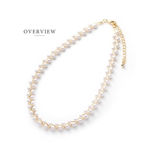 パールを編み込んだ華やかなショートネックレス。女性らしい上品な印象に仕上がります。アジャスターを短めにすればチョーカーとしても楽しめ、パーティーシーンやお呼ばれにぴったりなひと品◎