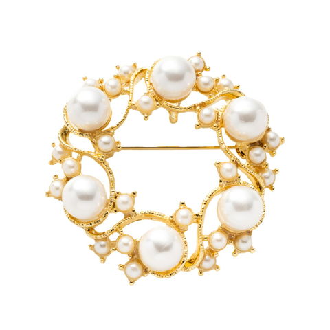 パールを円形に並べた優美なフォルムが大人上品なブローチ。大きさの異なるパールが品の良い女性らしい印象を演出します。お祝いシーンなど華やかな装いのワンポイント使いにおすすめです。