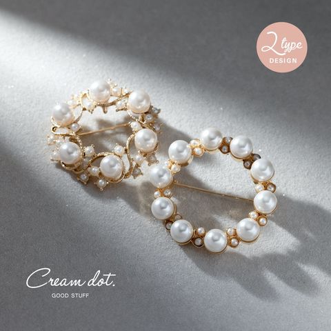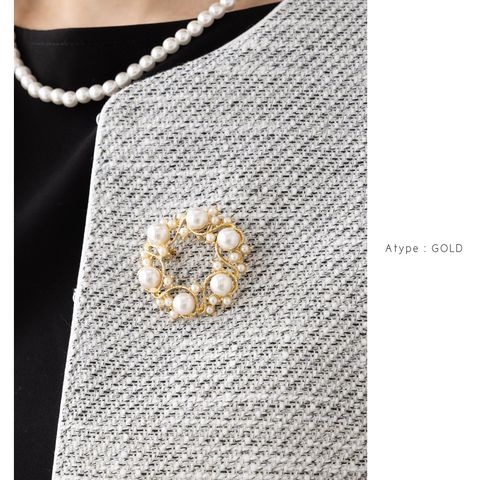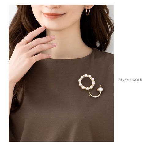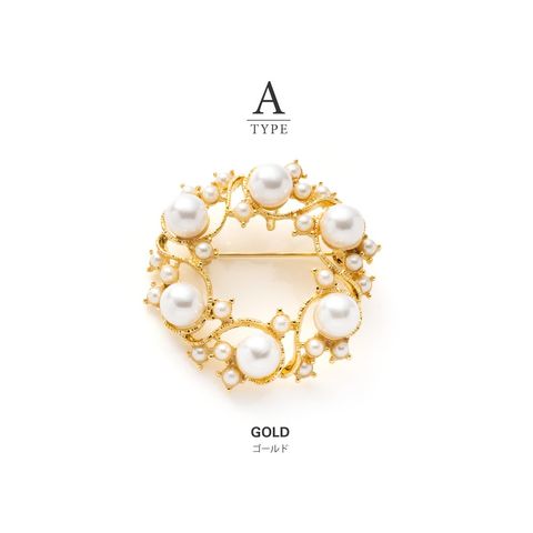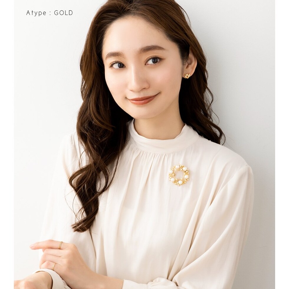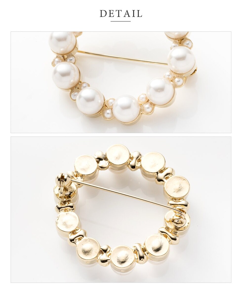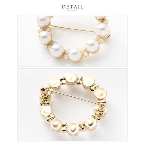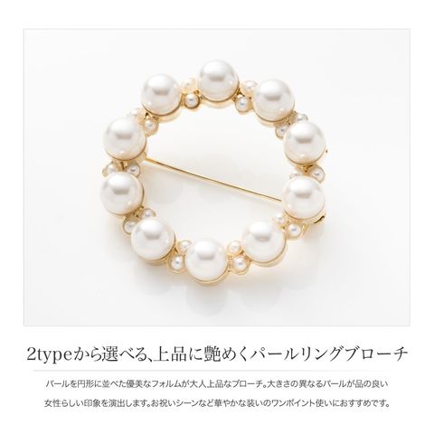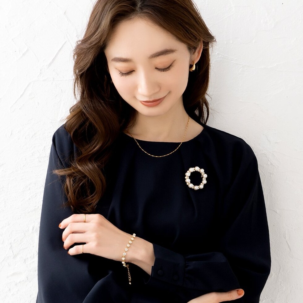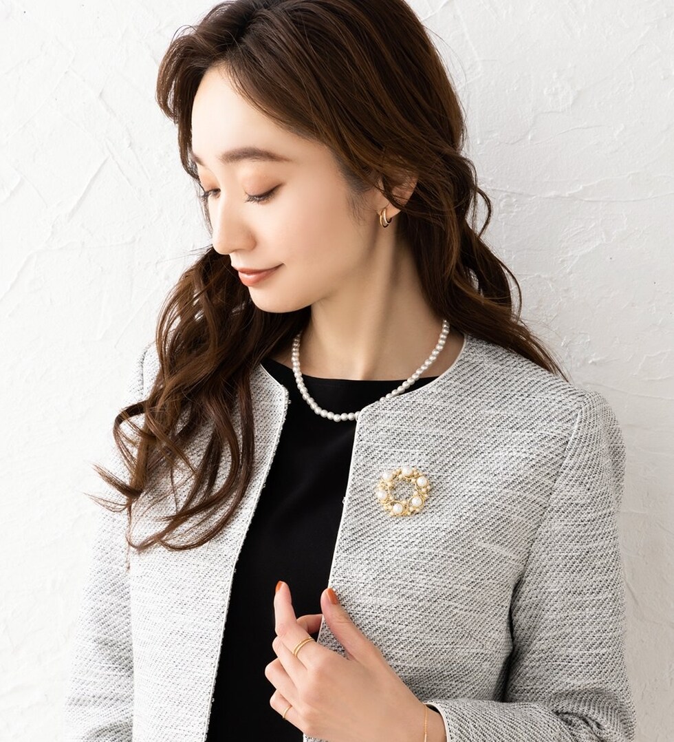 パールを円形に並べた優美なフォルムが大人上品なブローチ。大きさの異なるパールが品の良い女性らしい印象を演出します。お祝いシーンなど華やかな装いのワンポイント使いにおすすめです。