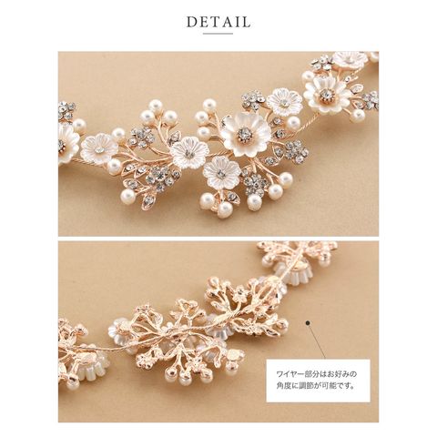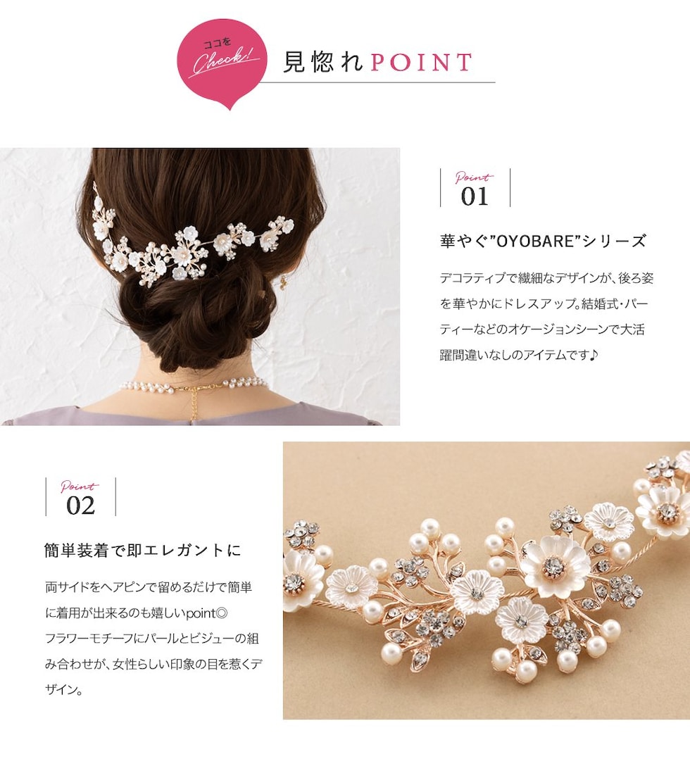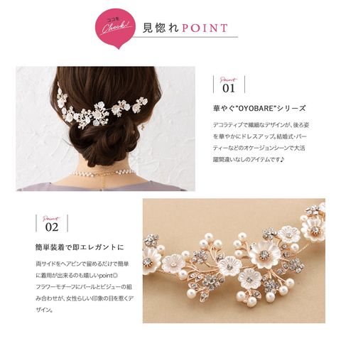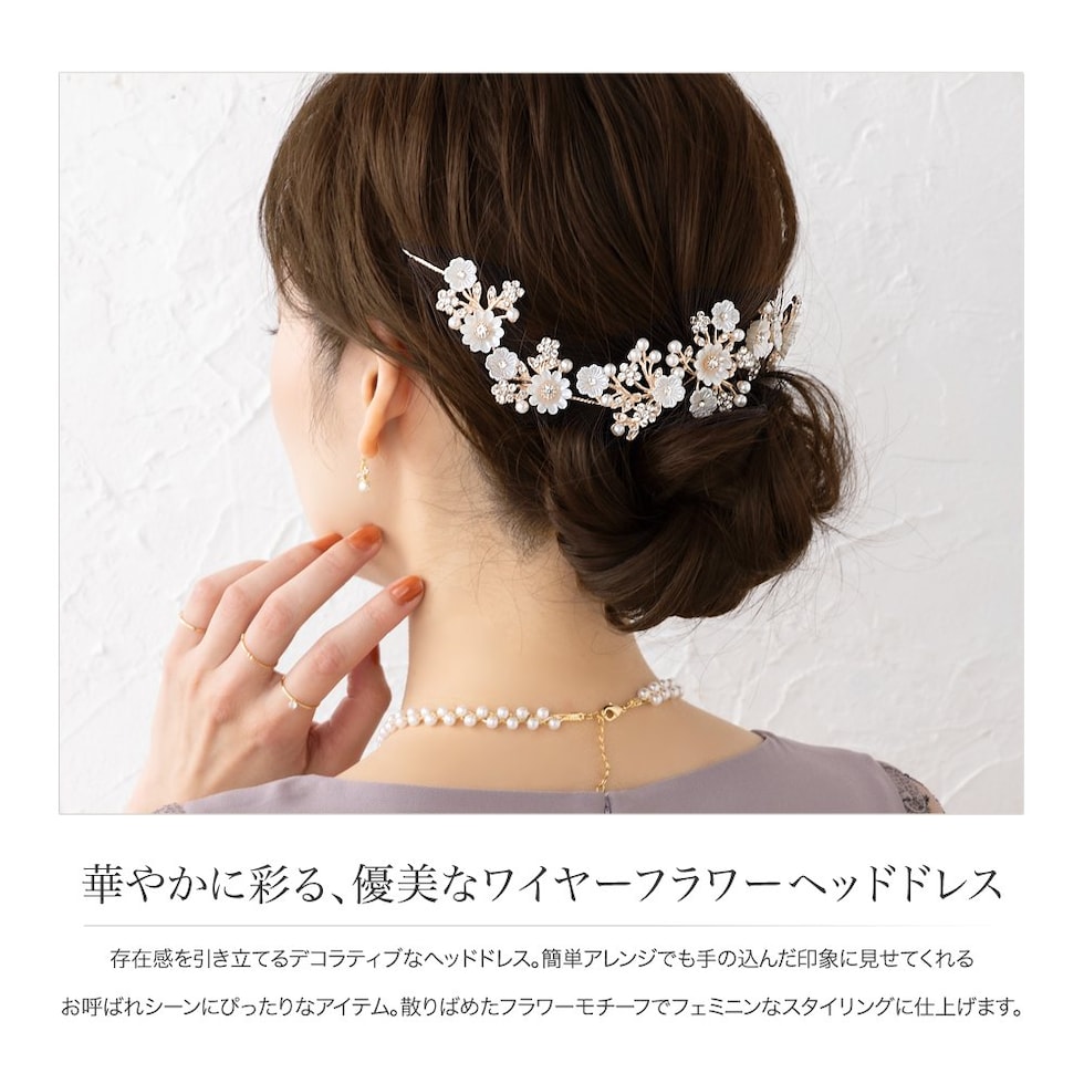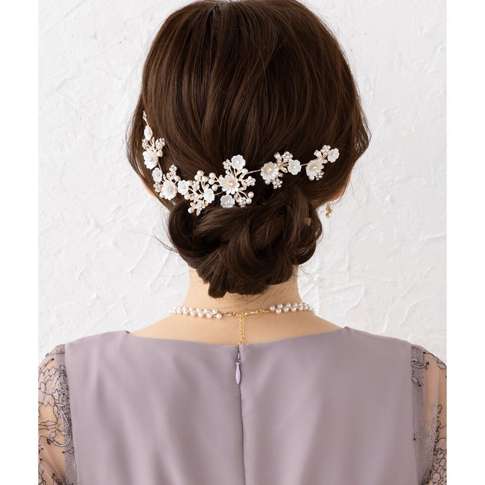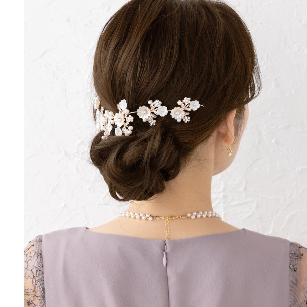 存在感を引き立てるデコラティブなヘッドドレス。簡単アレンジでも手の込んだ印象に見せてくれるお呼ばれシーンにぴったりなアイテム。散りばめたフラワーモチーフでフェミニンなスタイリングに仕上げます。
