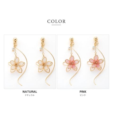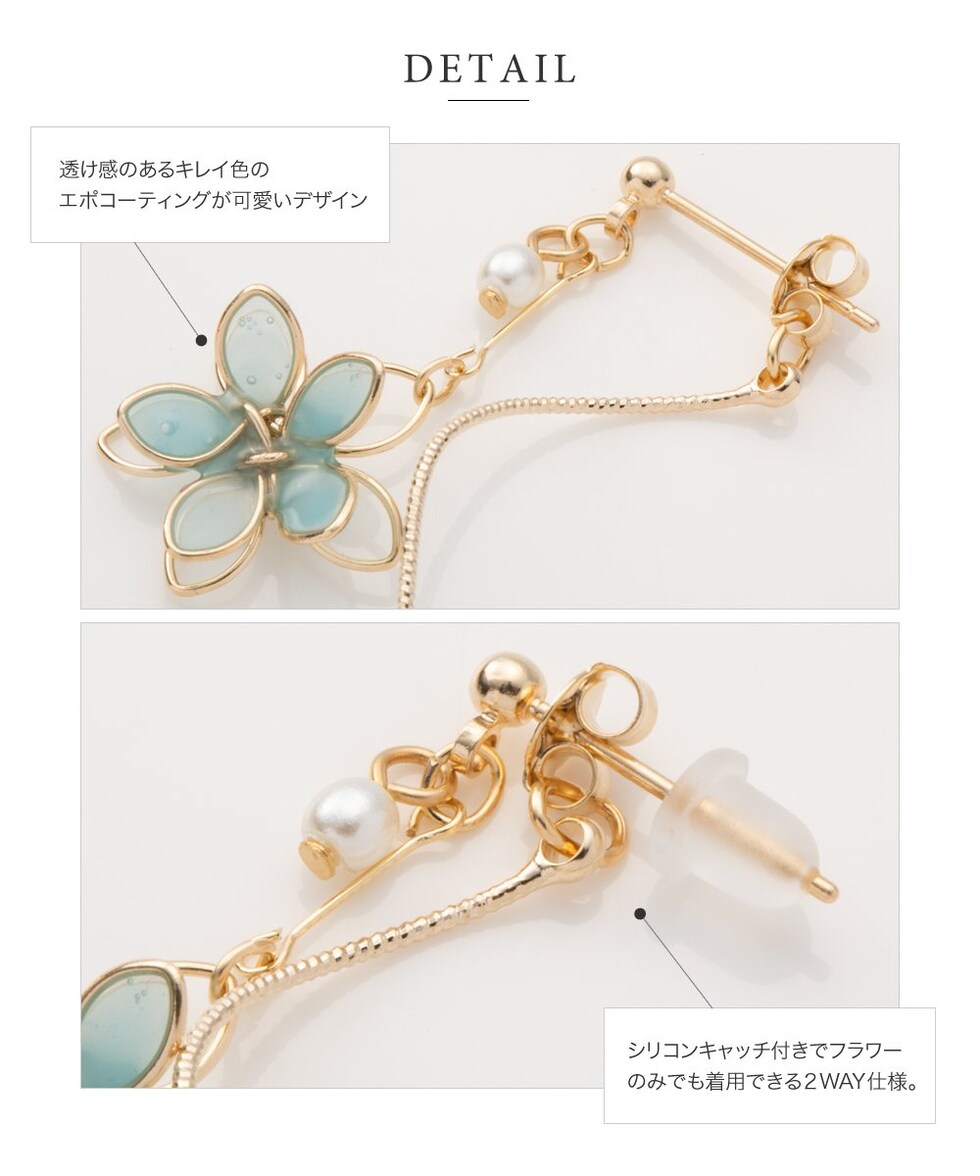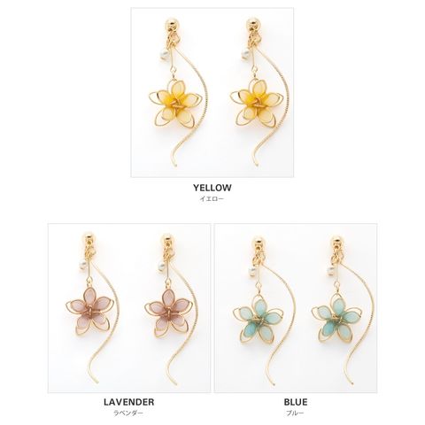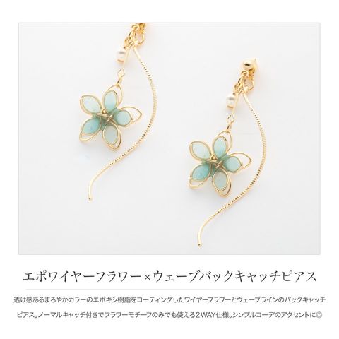 透け感あるまろやかカラーのエポキシ樹脂をコーティングしたワイヤーフラワーとウェーブラインのバックキャッチピアス。ノーマルキャッチ付きでフラワーモチーフのみでも使える2WAY仕様。シンプルコーデのアクセントに◎