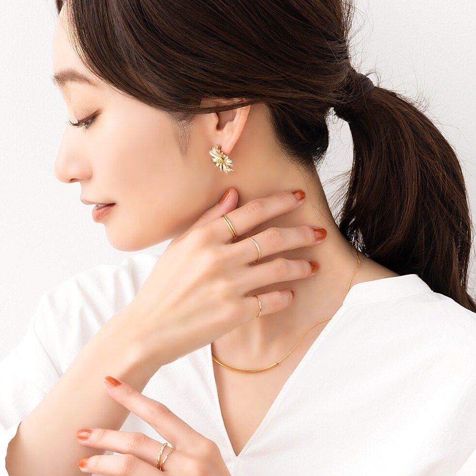お出かけコーデの気分を上げてくれる大きめのサイズ。アイコニックなデザインピアスは存在感たっぷりで、結婚式やお呼ばれなどのオケージョンシーンでも使えるアイテムです。