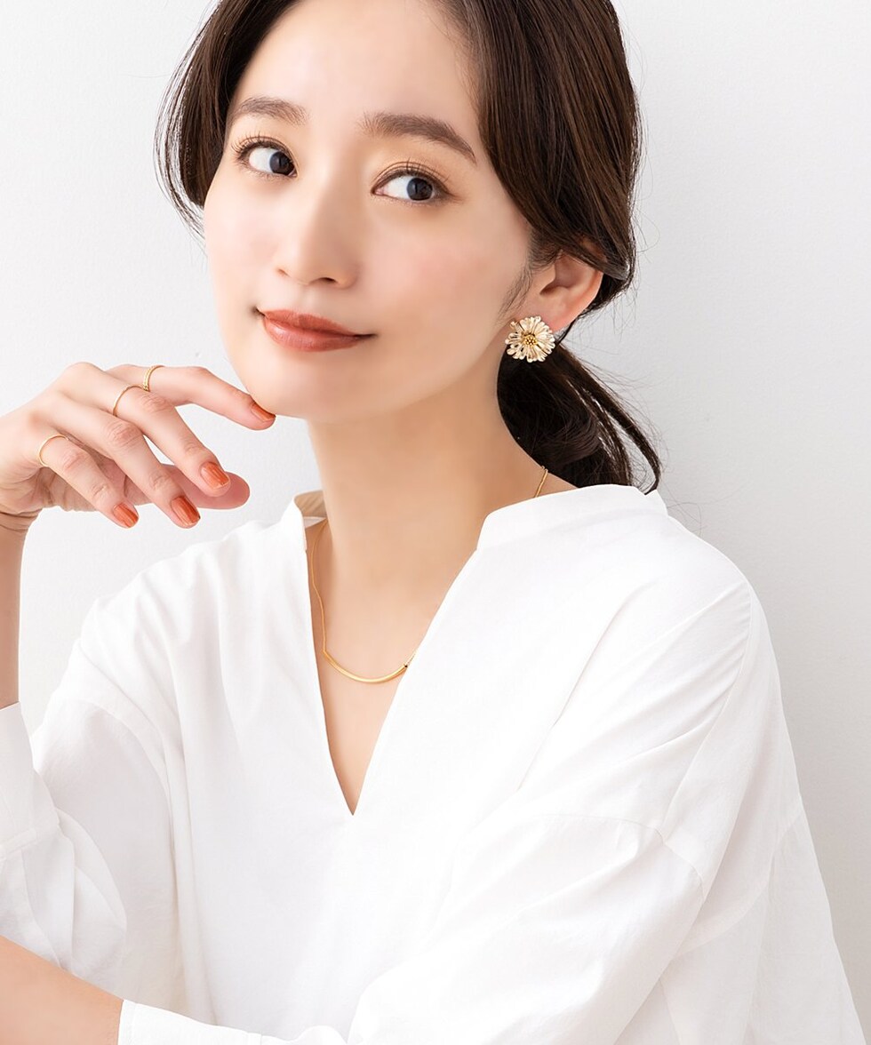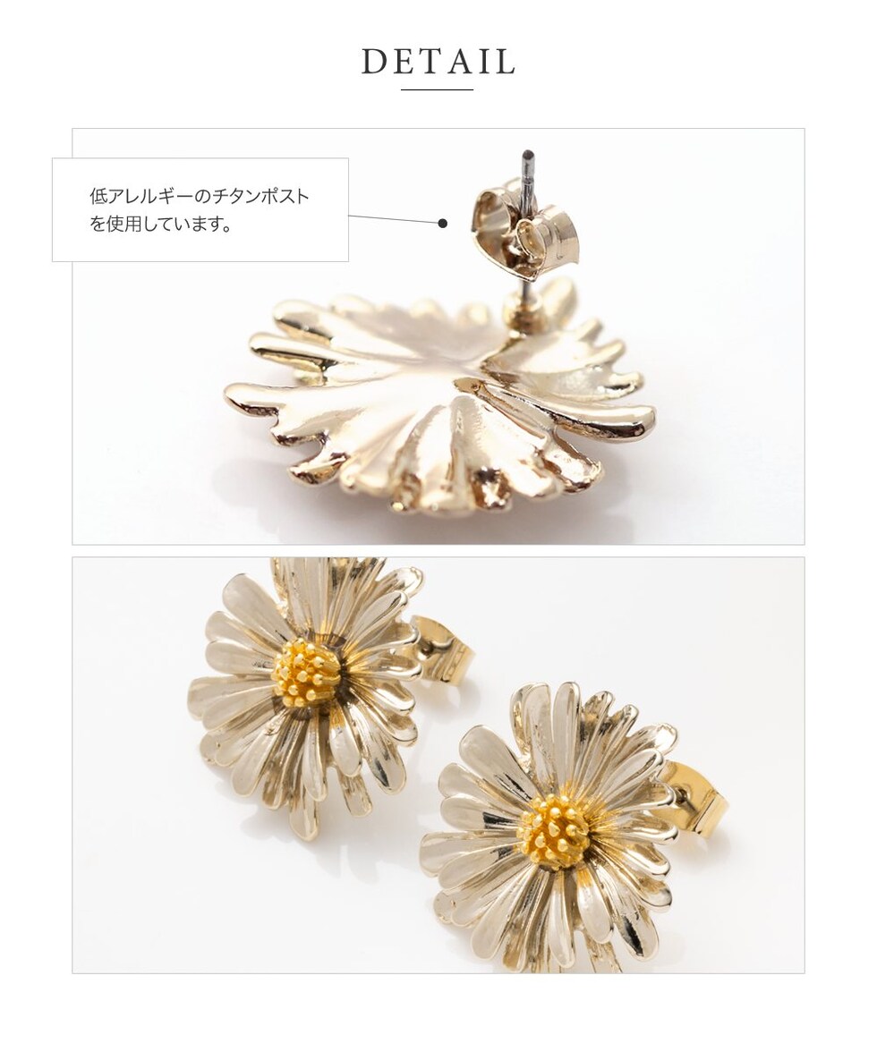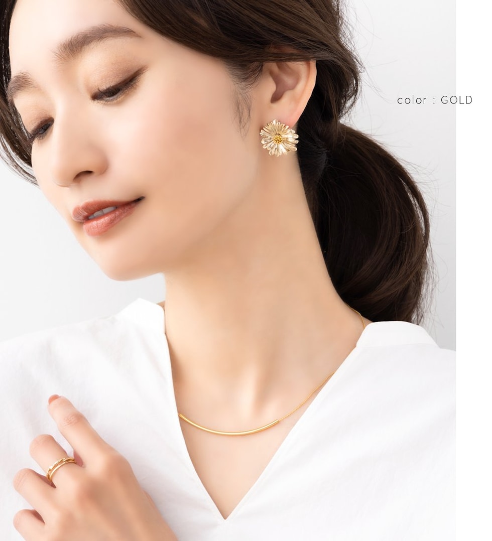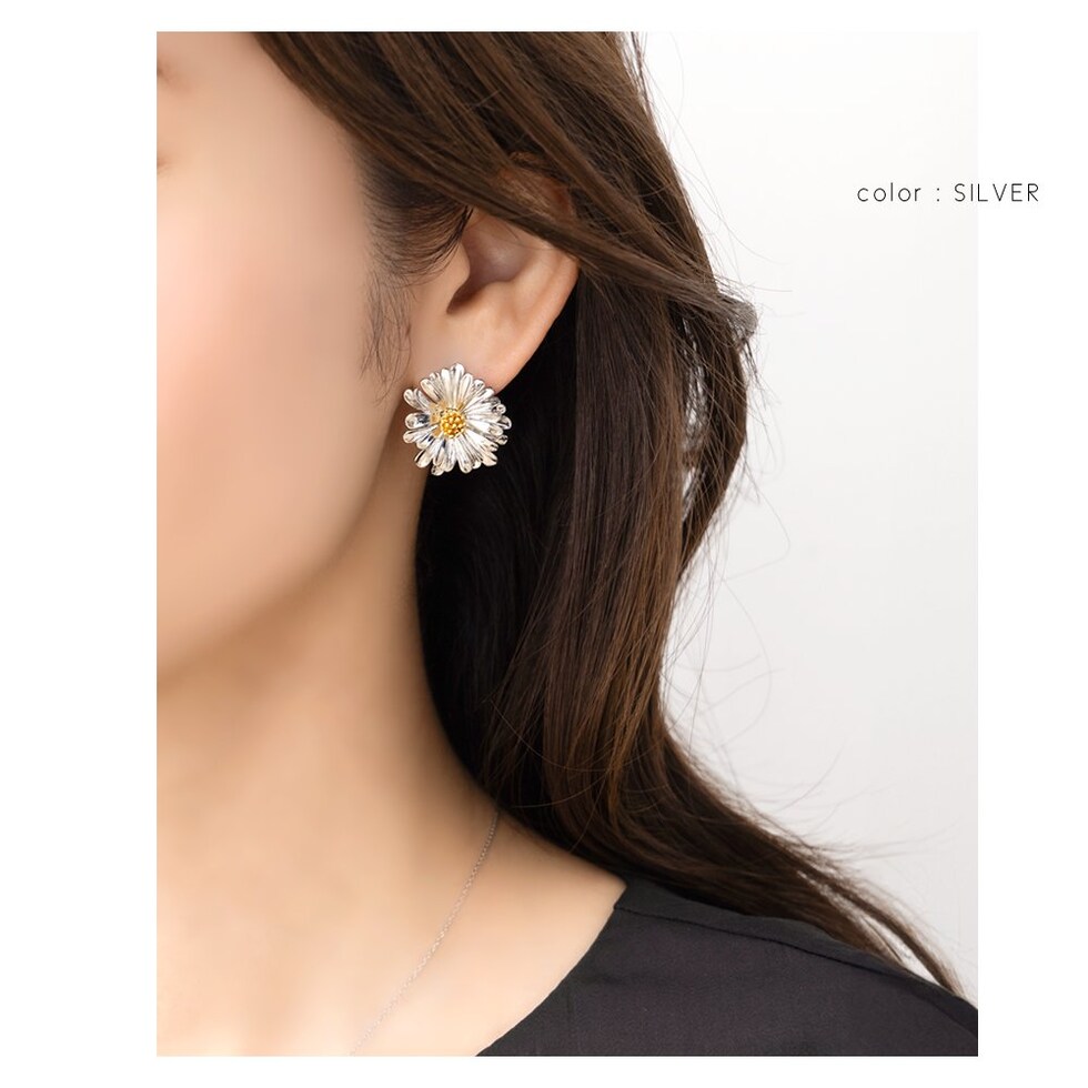 デイジーをモチーフにしたメタルフラワーのスタッドピアス。目を惹く大きめのサイズ感と立体感を持たせた繊細なデザインで高級感もバツグン◎シルバー色はミックスカラーになっているのも可愛いポイントです。