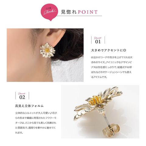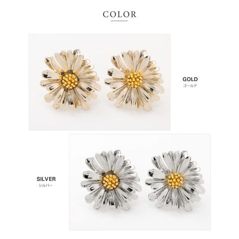 デイジーをモチーフにしたメタルフラワーのスタッドピアス。目を惹く大きめのサイズ感と立体感を持たせた繊細なデザインで高級感もバツグン◎シルバー色はミックスカラーになっているのも可愛いポイントです。