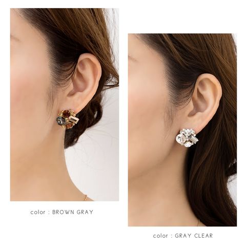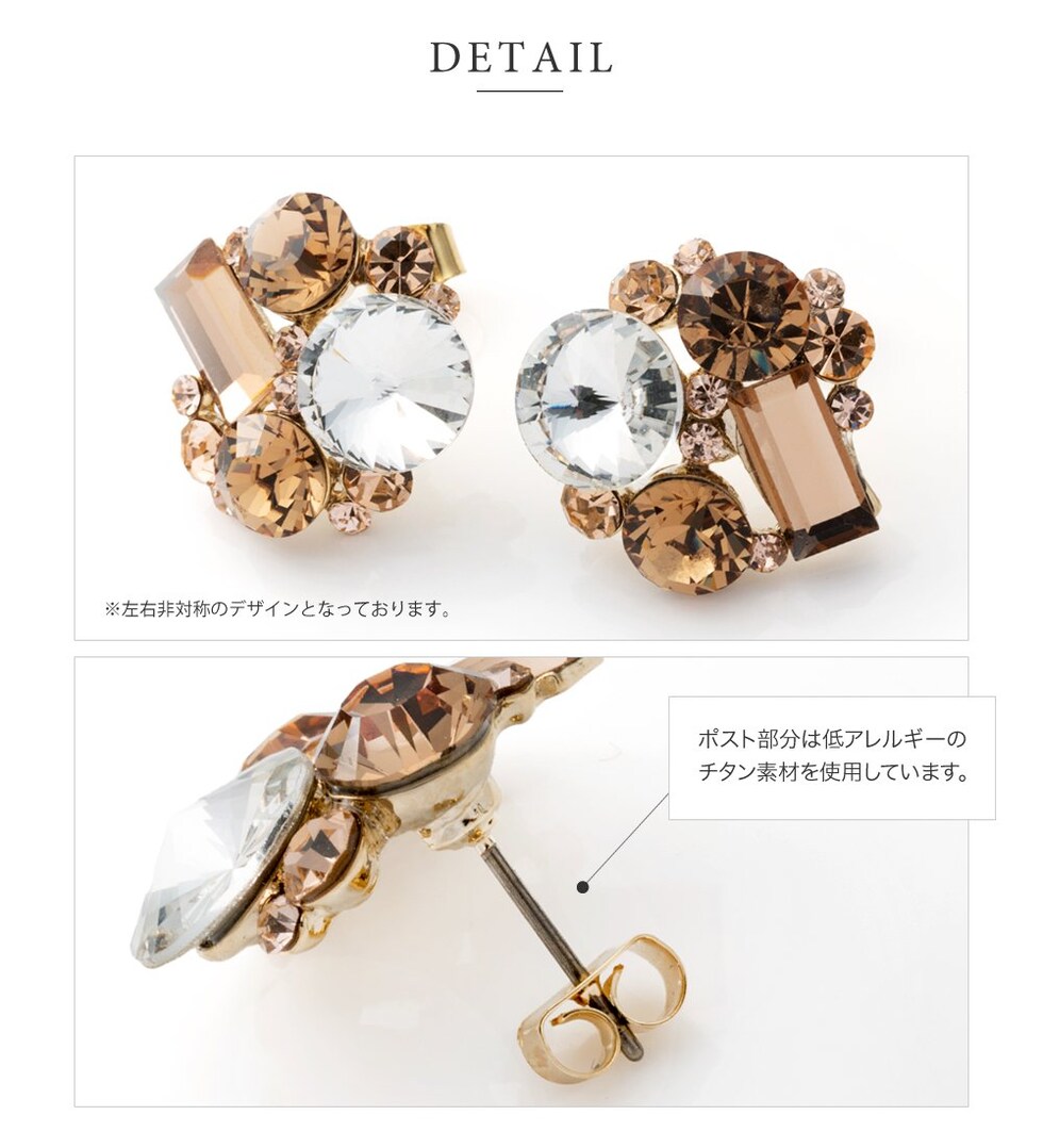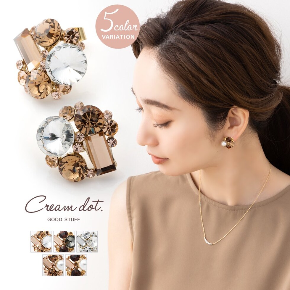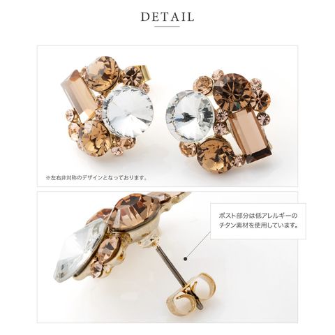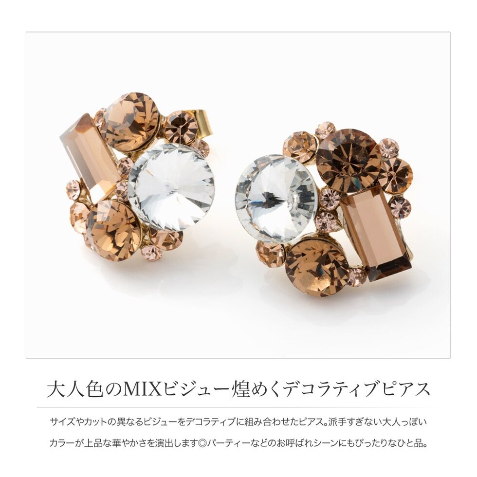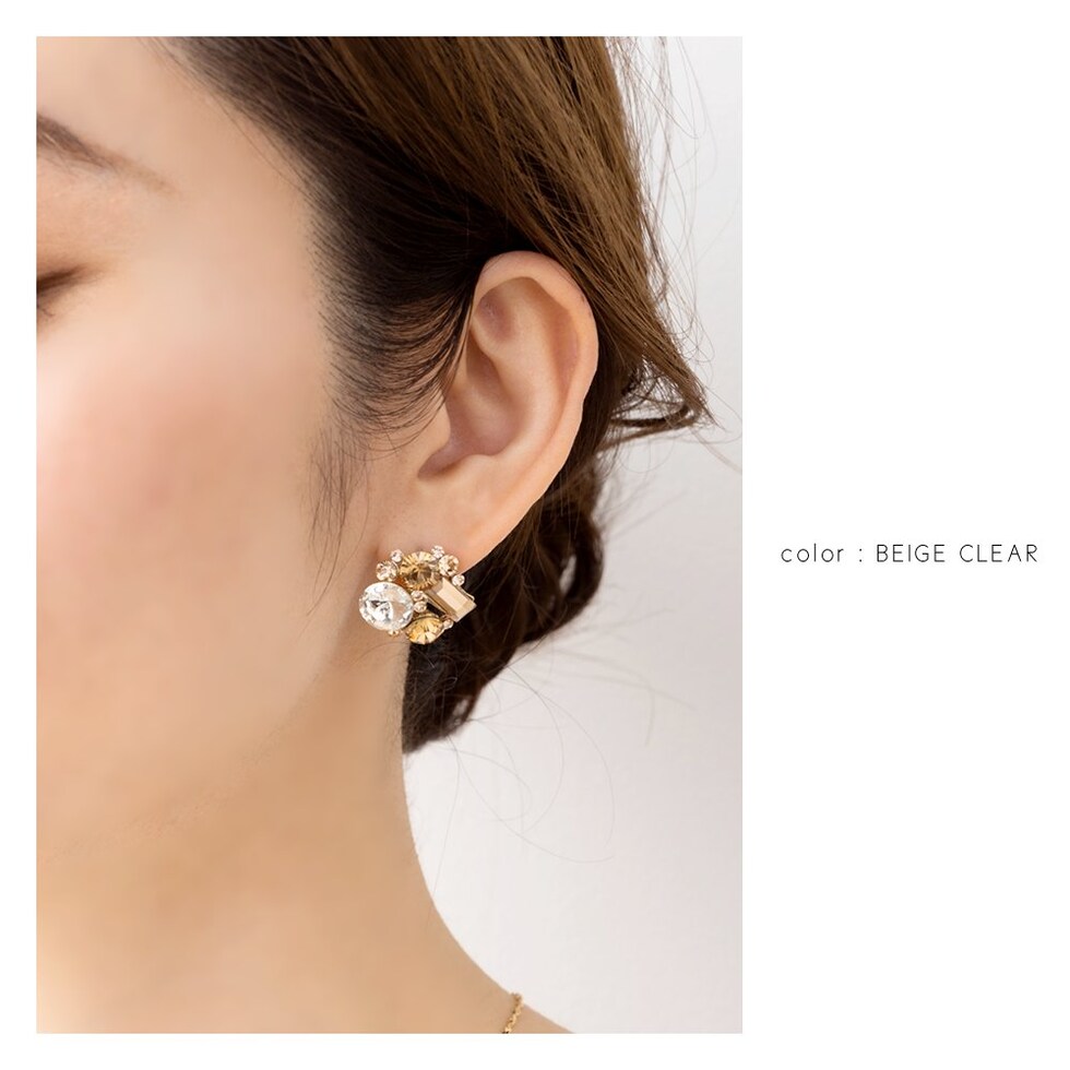 サイズやカットの異なるビジューをデコラティブに組み合わせたピアス。派手すぎない大人っぽいカラーが上品な華やかさを演出します◎パーティーなどのお呼ばれシーンにもぴったりなひと品。