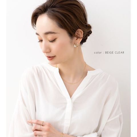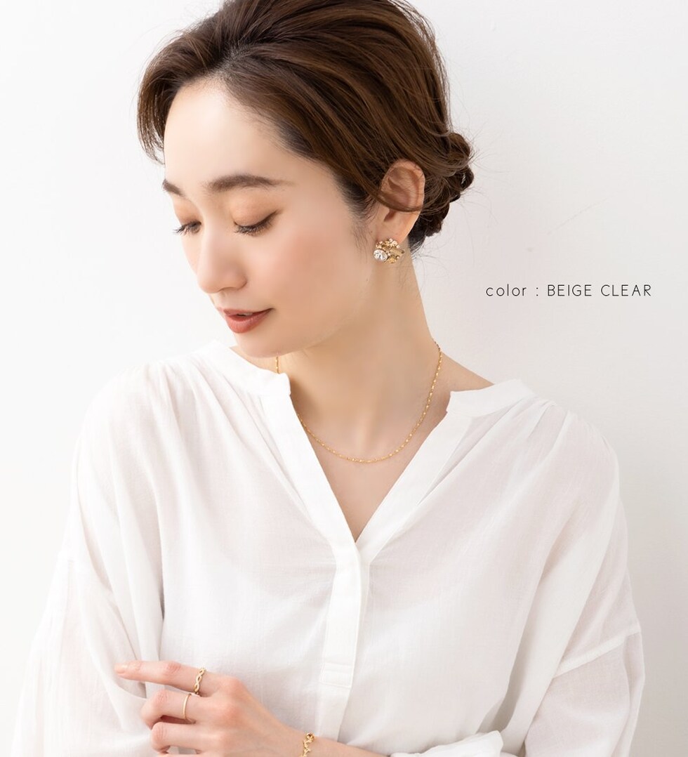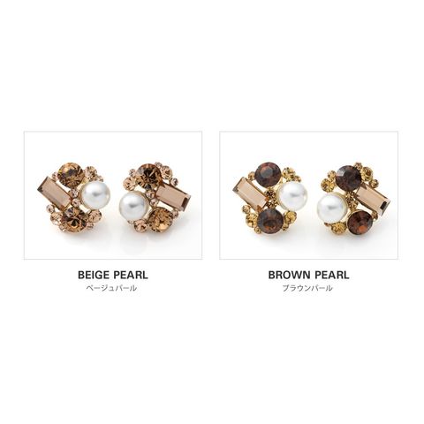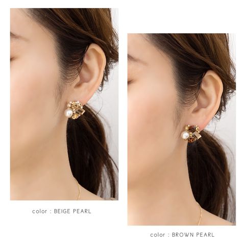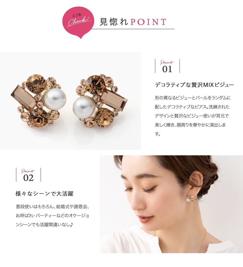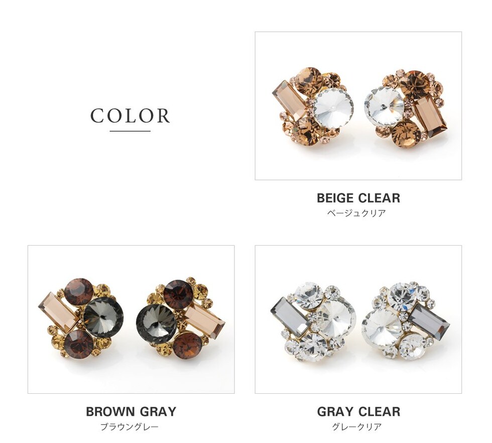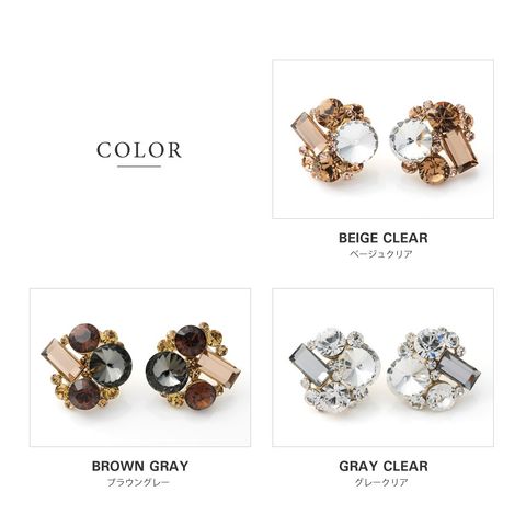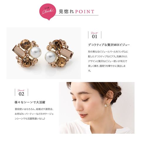 サイズやカットの異なるビジューをデコラティブに組み合わせたピアス。派手すぎない大人っぽいカラーが上品な華やかさを演出します◎パーティーなどのお呼ばれシーンにもぴったりなひと品。