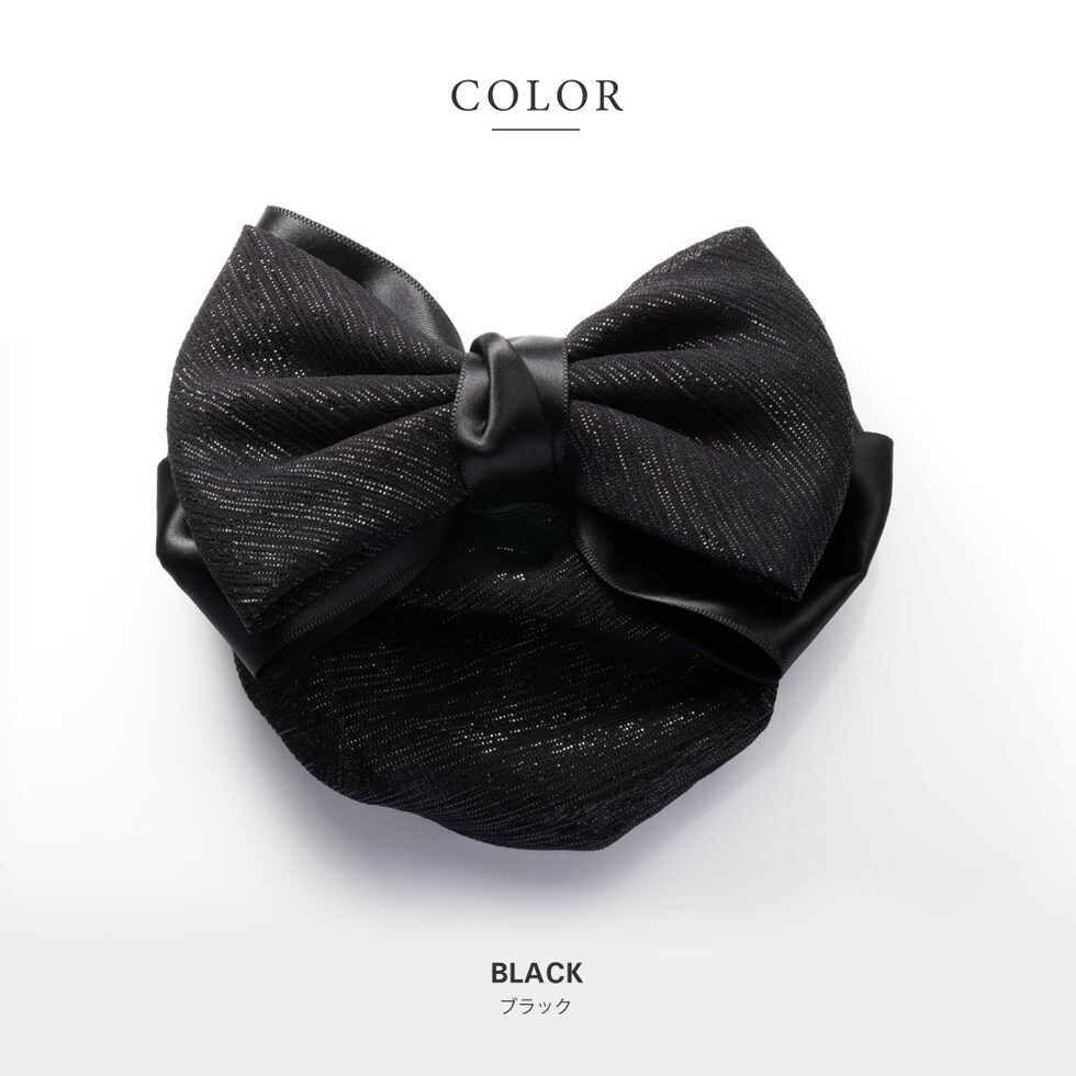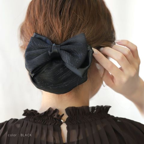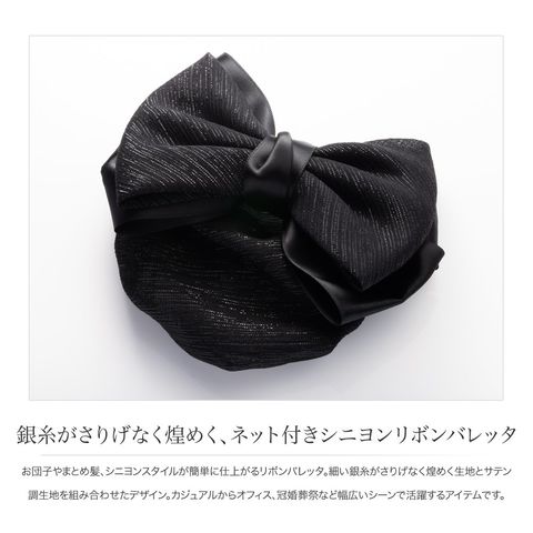 お団子やまとめ髪、シニヨンスタイルが簡単に仕上がるリボンバレッタ。細い銀糸がさりげなく煌めく生地とサテン調生地を組み合わせたデザイン。カジュアルからオフィス、冠婚葬祭など幅広いシーンで活躍するアイテムです。