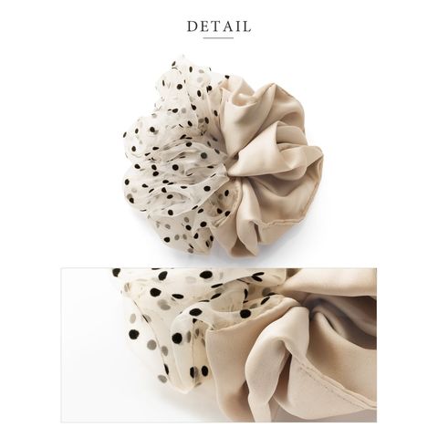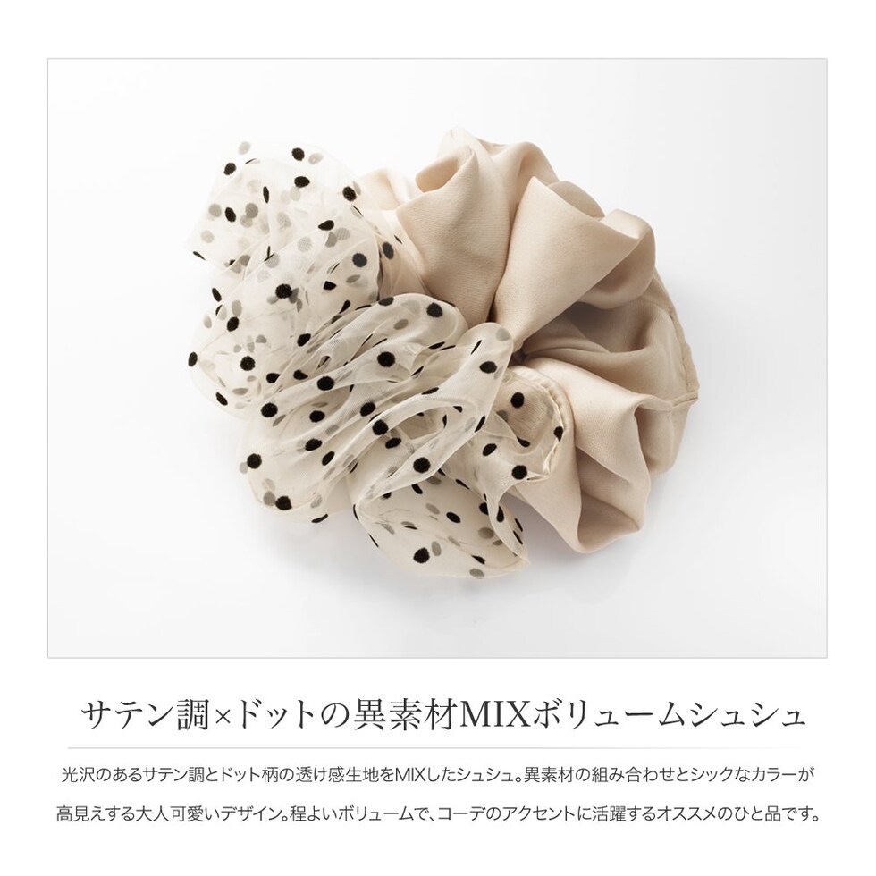 光沢のあるサテン調とドット柄の透け感生地をMIXしたシュシュ。異素材の組み合わせとシックなカラーが高見えする大人可愛いデザイン。程よいボリュームで、コーデのアクセントに活躍するオススメのひと品です。