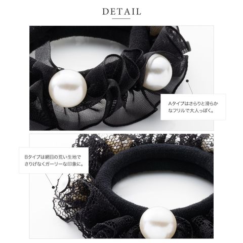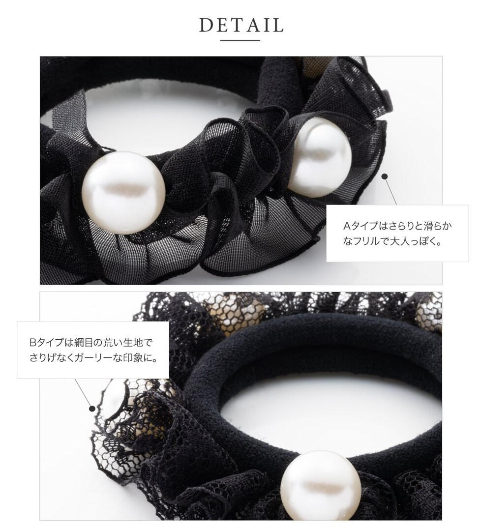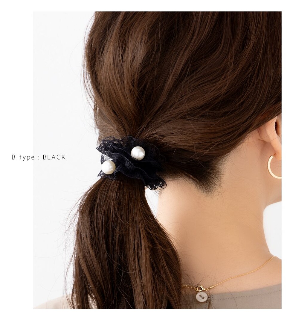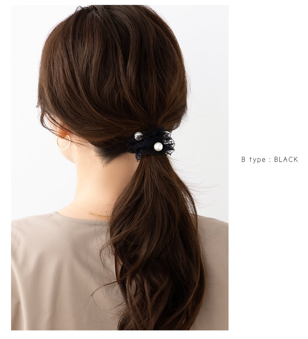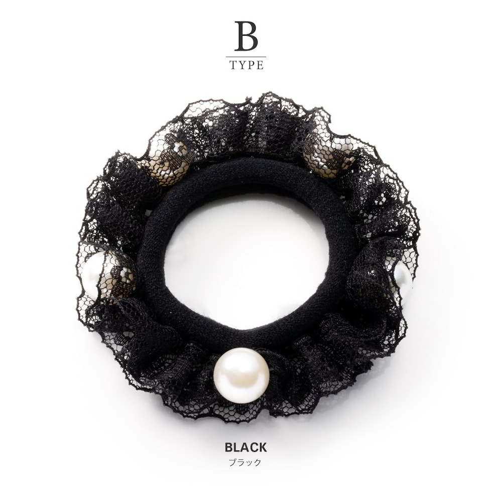 ヘアアクセサリー レディース ヘアゴム 髪留め まとめ髪 2タイプ レース パール フリル 跡がつきにくい ブラック cream dot ゆうパケット [A:ブラック_ワンサイズ]