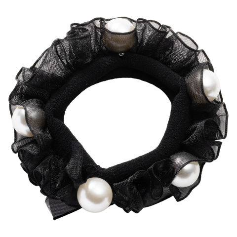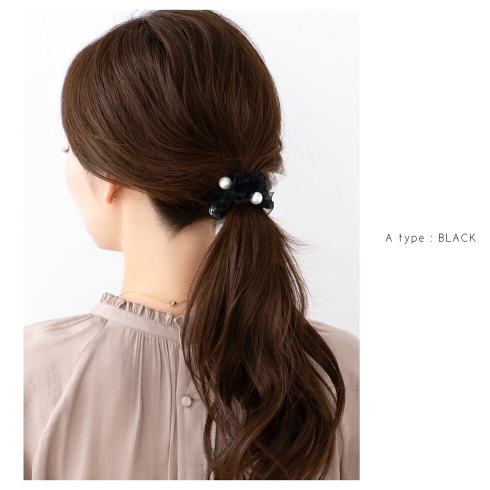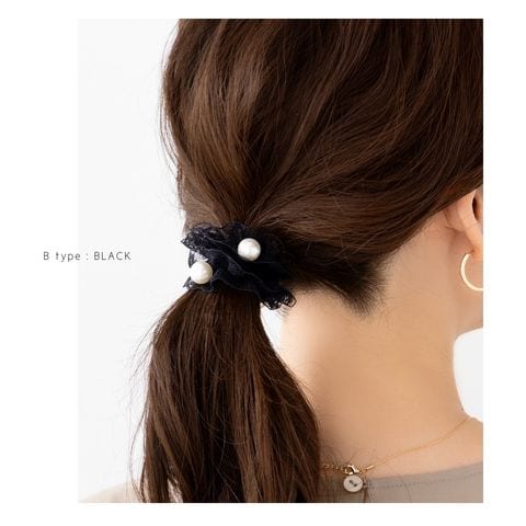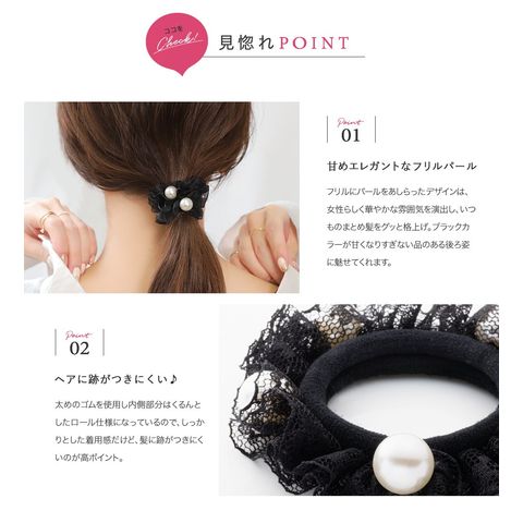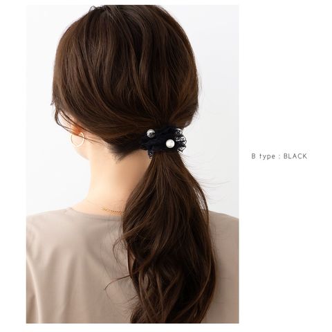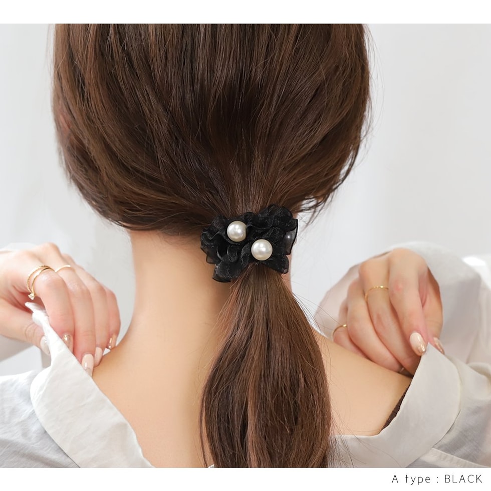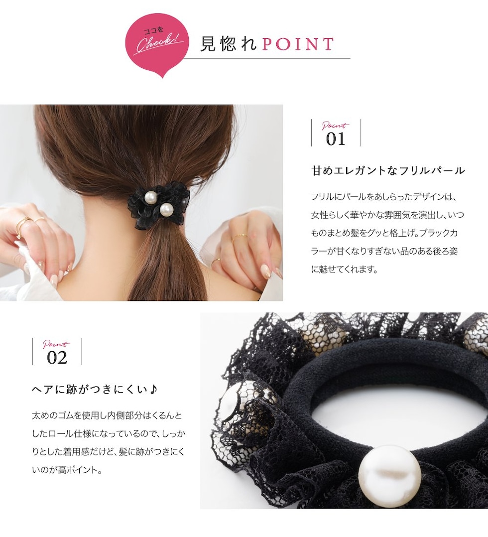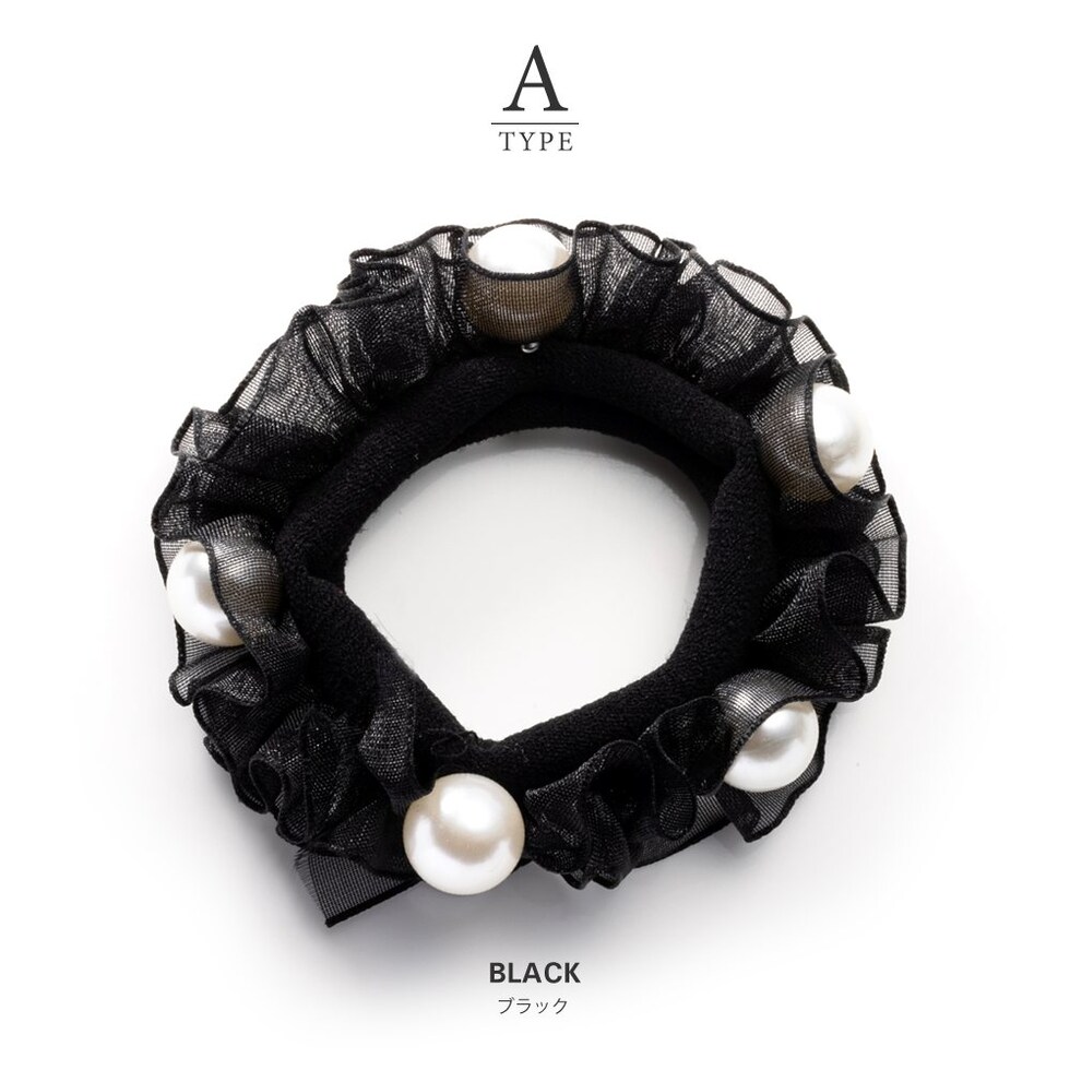 ヘアアクセサリー レディース ヘアゴム 髪留め まとめ髪 2タイプ レース パール フリル 跡がつきにくい ブラック cream dot ゆうパケット [A:ブラック_ワンサイズ]