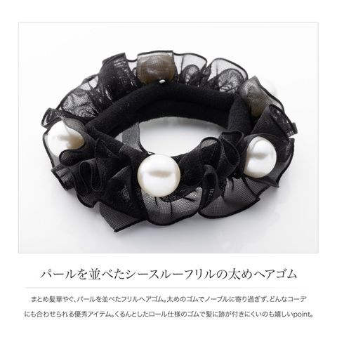 まとめ髪華やぐ、パールを並べたフリルヘアゴム。太めのゴムでノーブルに寄り過ぎず、どんなコーデにも合わせられる優秀アイテム。くるんとしたロール仕様のゴムで髪に跡が付きにくいのも嬉しいpoint。