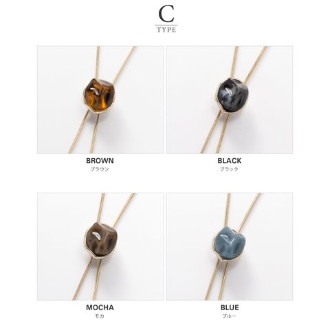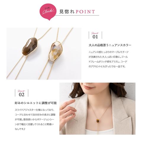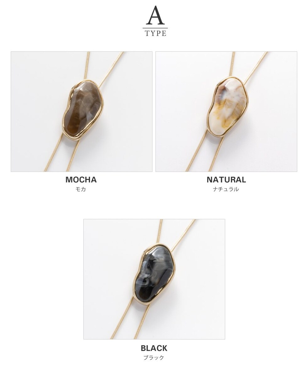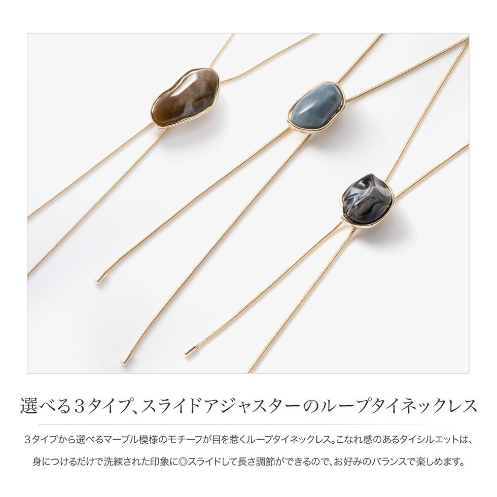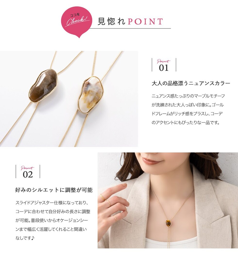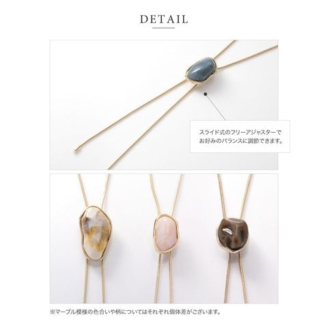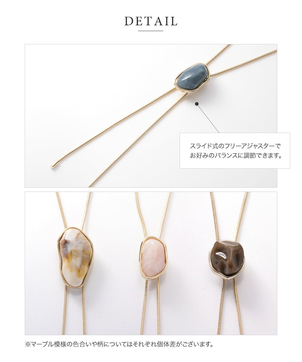 3タイプから選べるマーブル模様のモチーフが目を惹くループタイネックレス。こなれ感のあるタイシルエットは、身につけるだけで洗練された印象に◎スライドして長さ調節ができるので、お好みのバランスで楽しめます。
