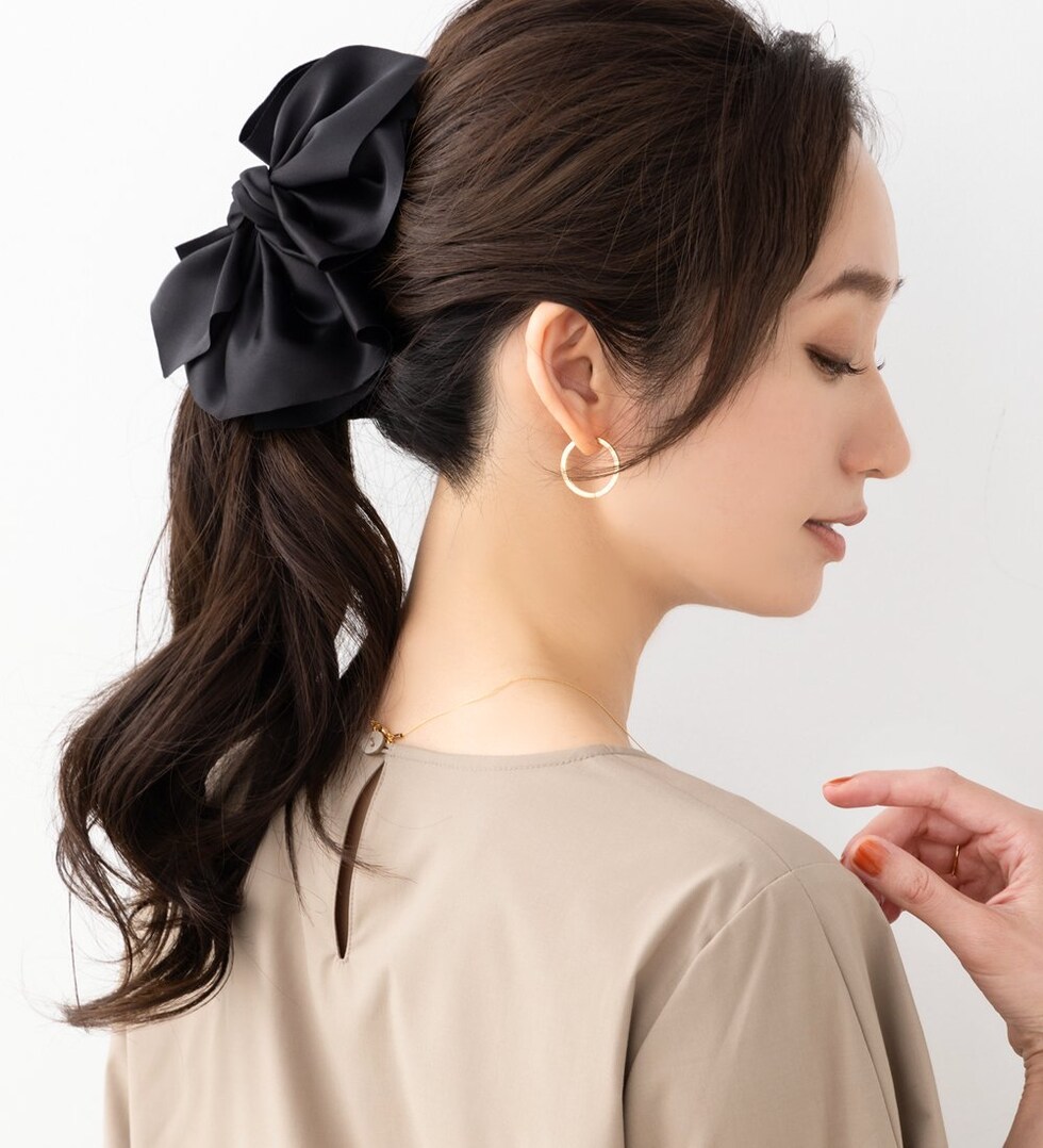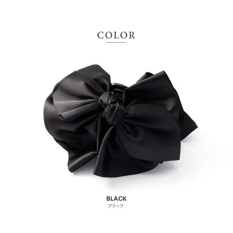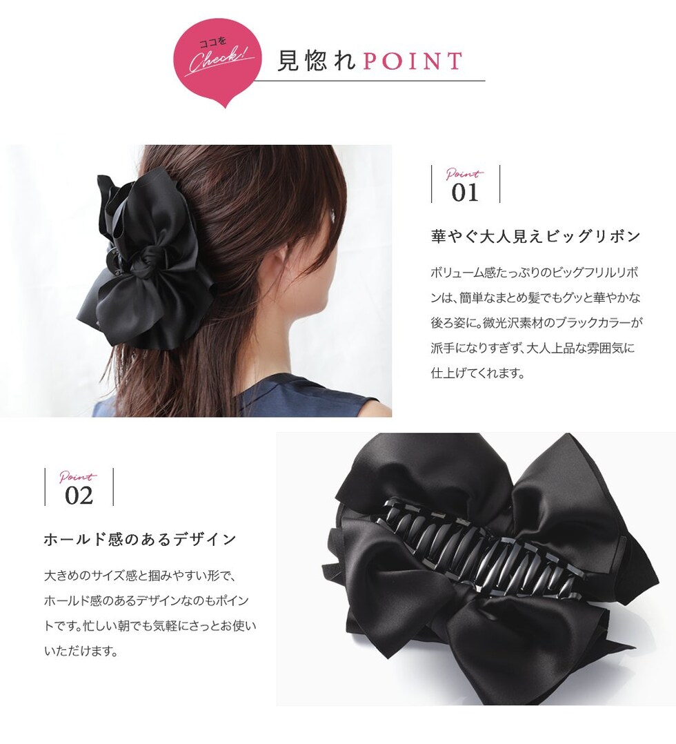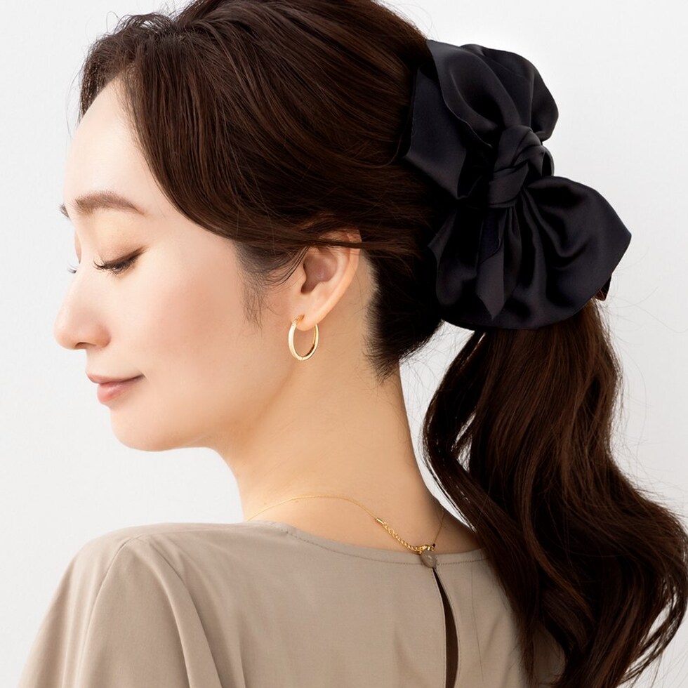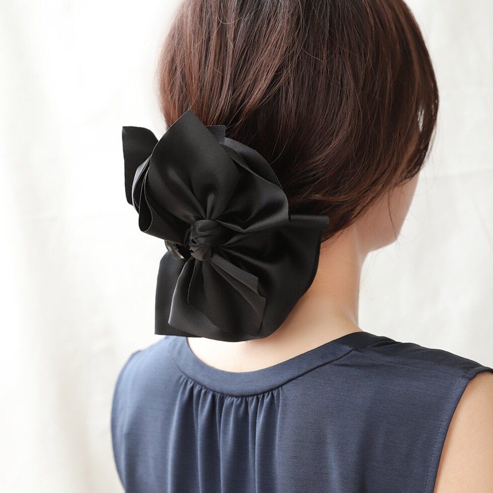 ボリューム感たっぷりのビッグフリルリボンは、簡単なまとめ髪でもグッと華やかな後ろ姿に。微光沢素材のブラックカラーが派手になりすぎず、大人上品な雰囲気に仕上げてくれます。