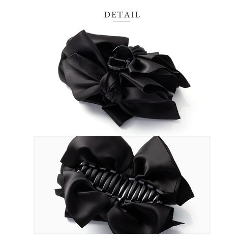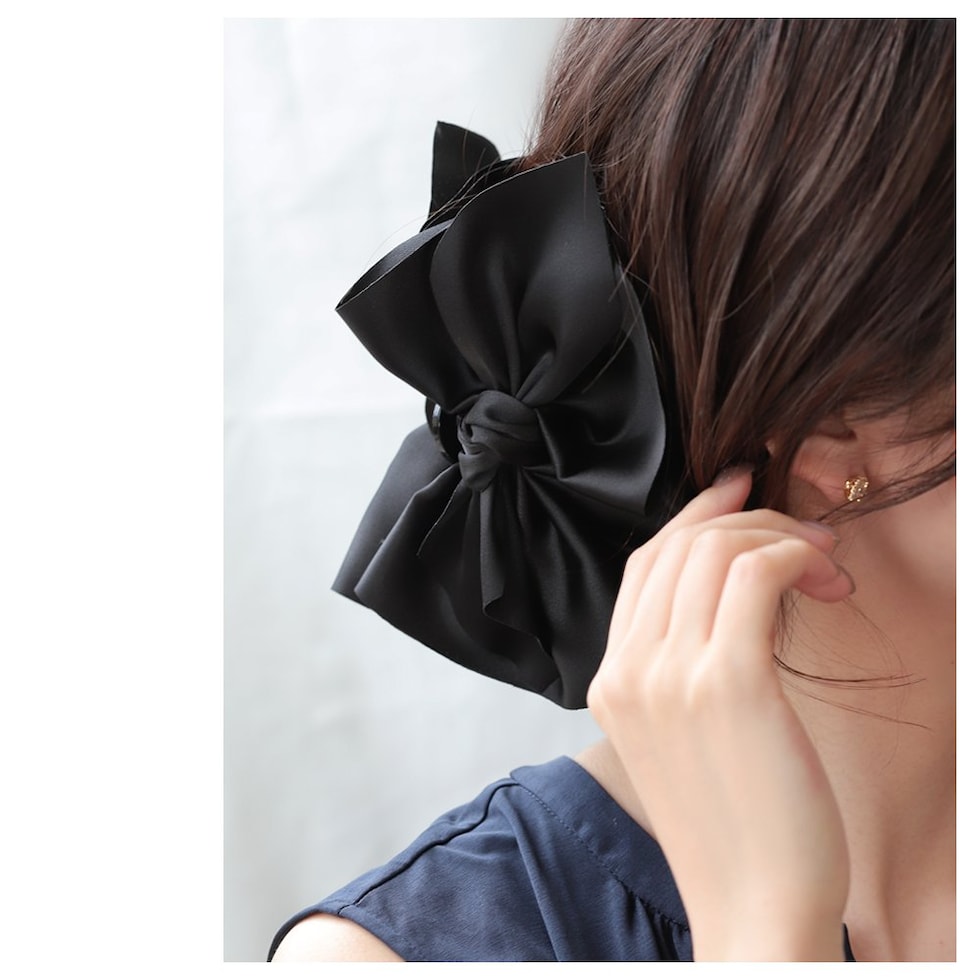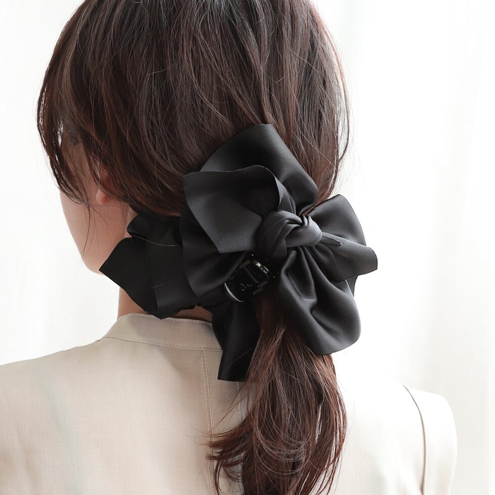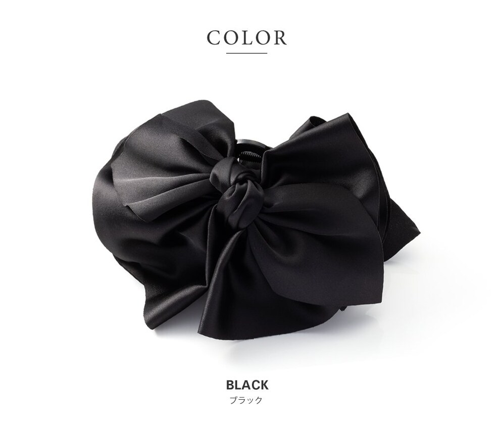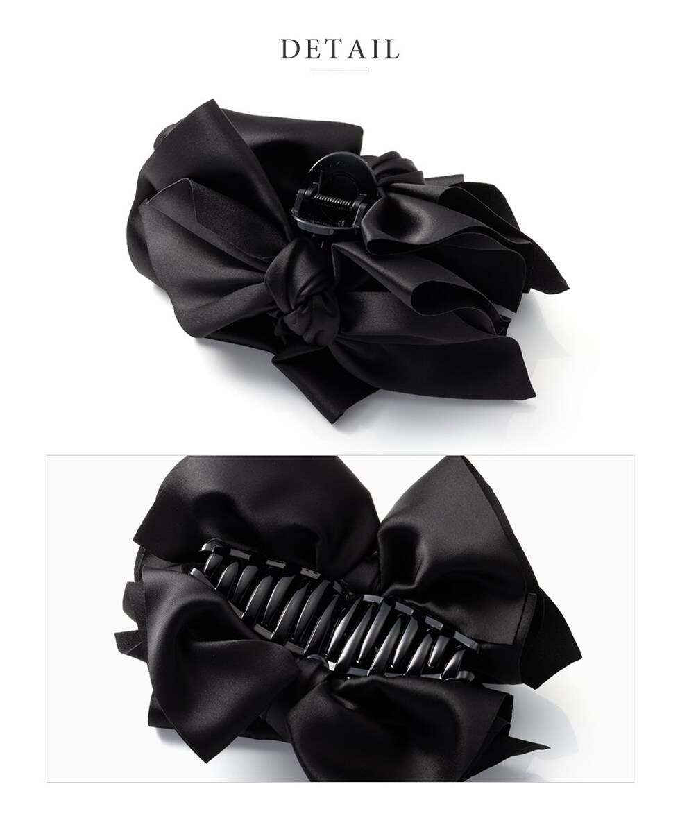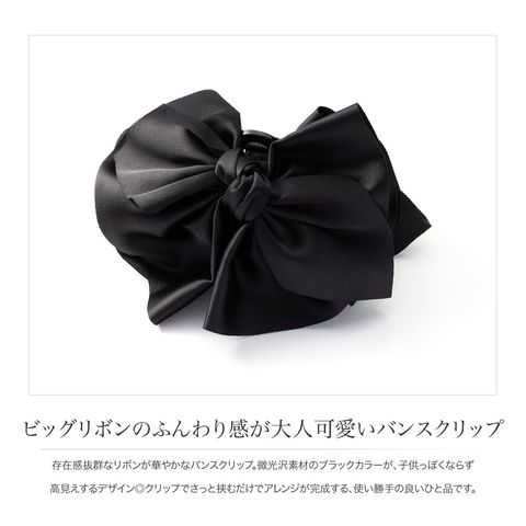 存在感抜群なリボンが華やかなバンスクリップ。微光沢素材のブラックカラーが、子供っぽくならず高見えするデザイン◎クリップでさっと挟むだけでアレンジが完成する、使い勝手の良いひと品です。