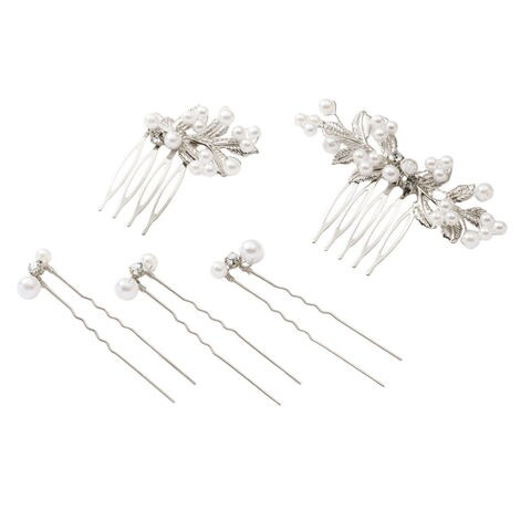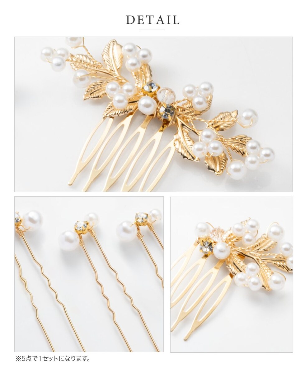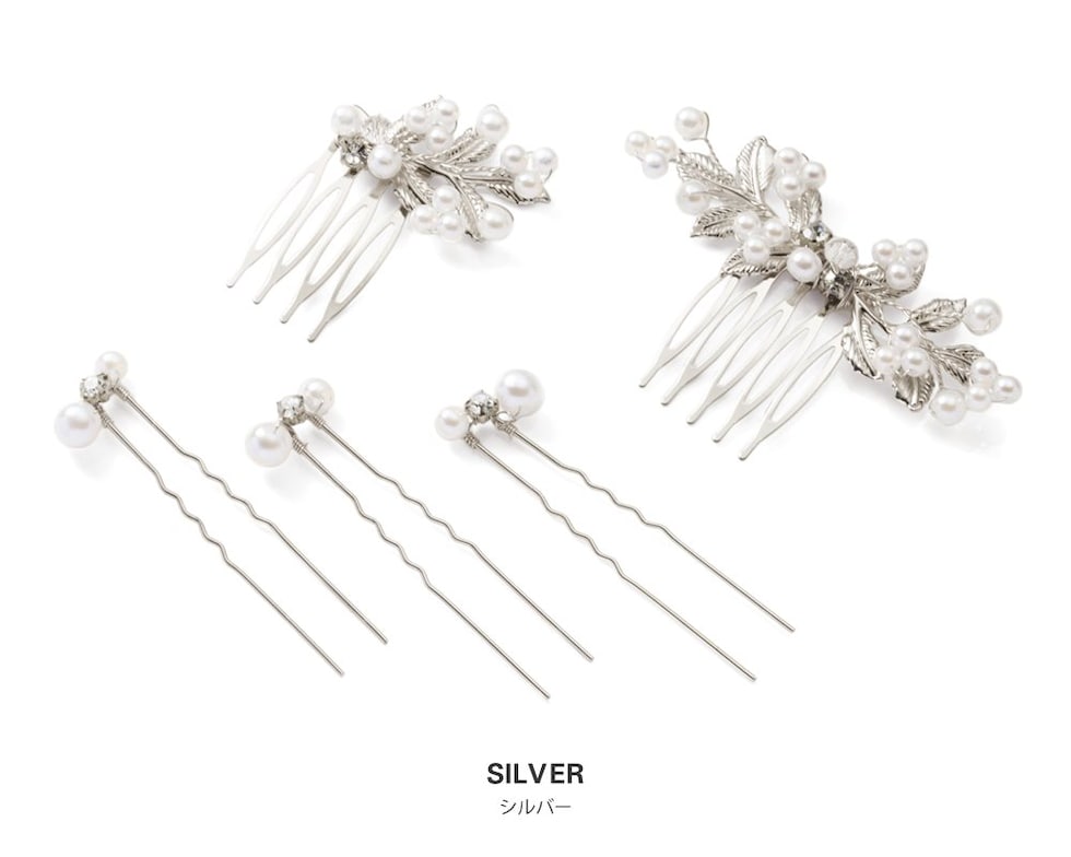 ヘアアクセサリー レディース 5点セット ヘアピン ヘアコーム ヘッドアクセサリー パール リーフ 葉 まとめ髪 髪飾り 花飾り ゲスト cream dot ゆうパケット [シルバー_アソート]
