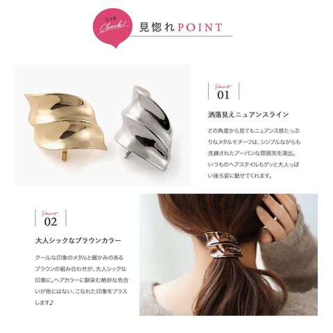 艶やかなメタルがお洒落なニュアンスラインポニーフック。角度によって雰囲気が変わるロールシルエットが存在感抜群なアイテム◎モードな雰囲気を纏ったデザインがコーデを格上げしてくれるひと品です。
