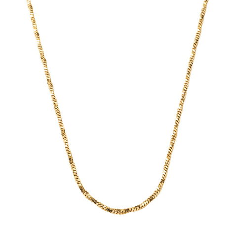 シンプルながらもデザイン性の高いツイストスネークチェーン。華奢ながらも存在感ある煌めきが大人上品な印象に仕上げてくれます。きれい目からカジュアルスタイルにもさらりとつけれて、デイリーに活躍してくれるアイテムです。