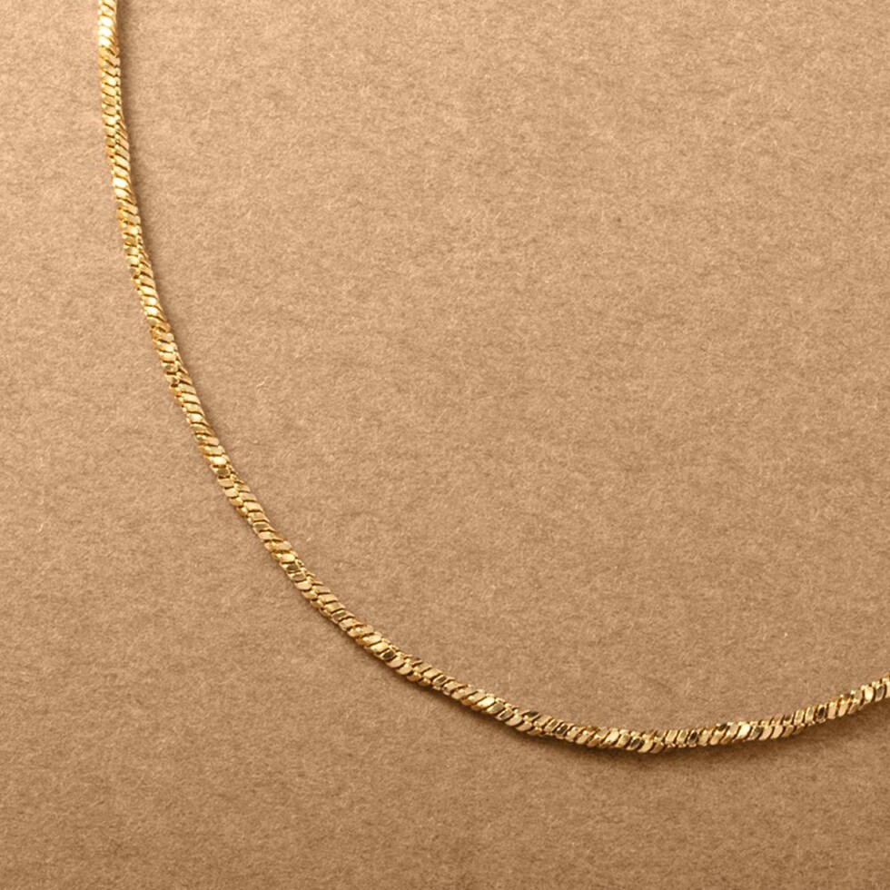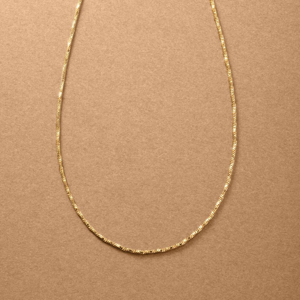 シンプルながらもデザイン性の高いツイストスネークチェーン。華奢ながらも存在感ある煌めきが大人上品な印象に仕上げてくれます。きれい目からカジュアルスタイルにもさらりとつけれて、デイリーに活躍してくれるアイテムです。