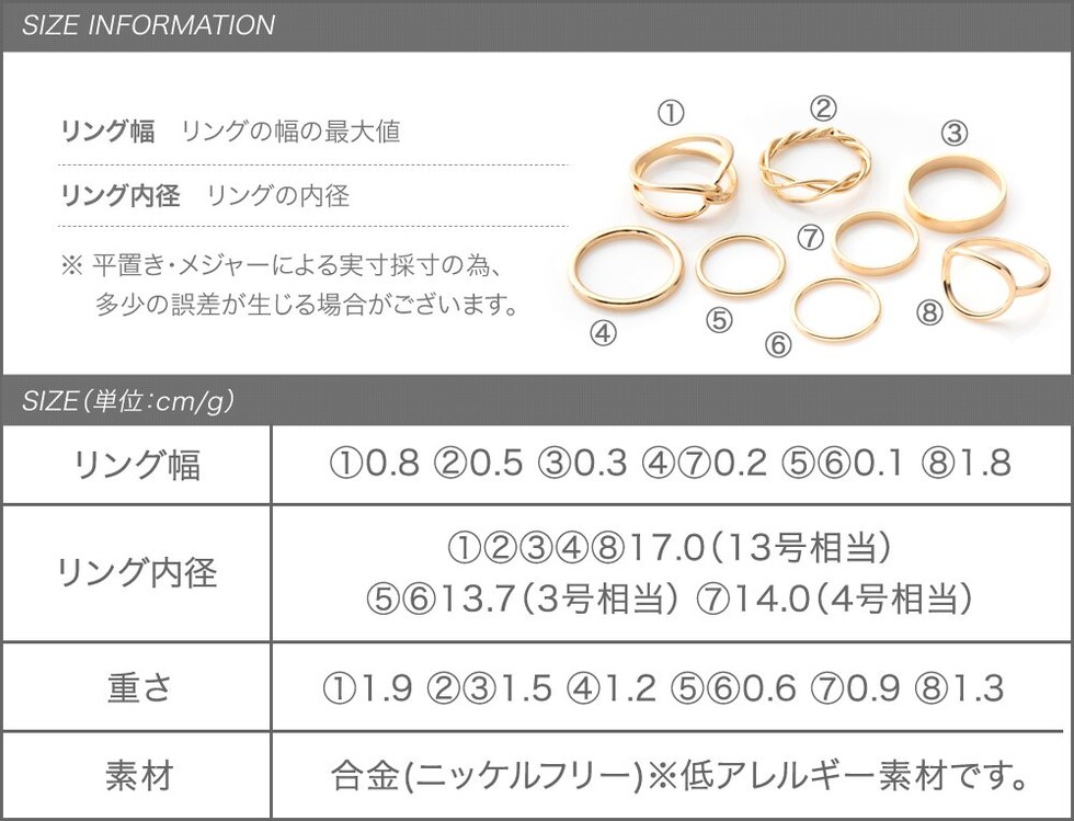 ピンキーからレギュラーサイズまで、豊富なセット内容が魅力のセットリング。