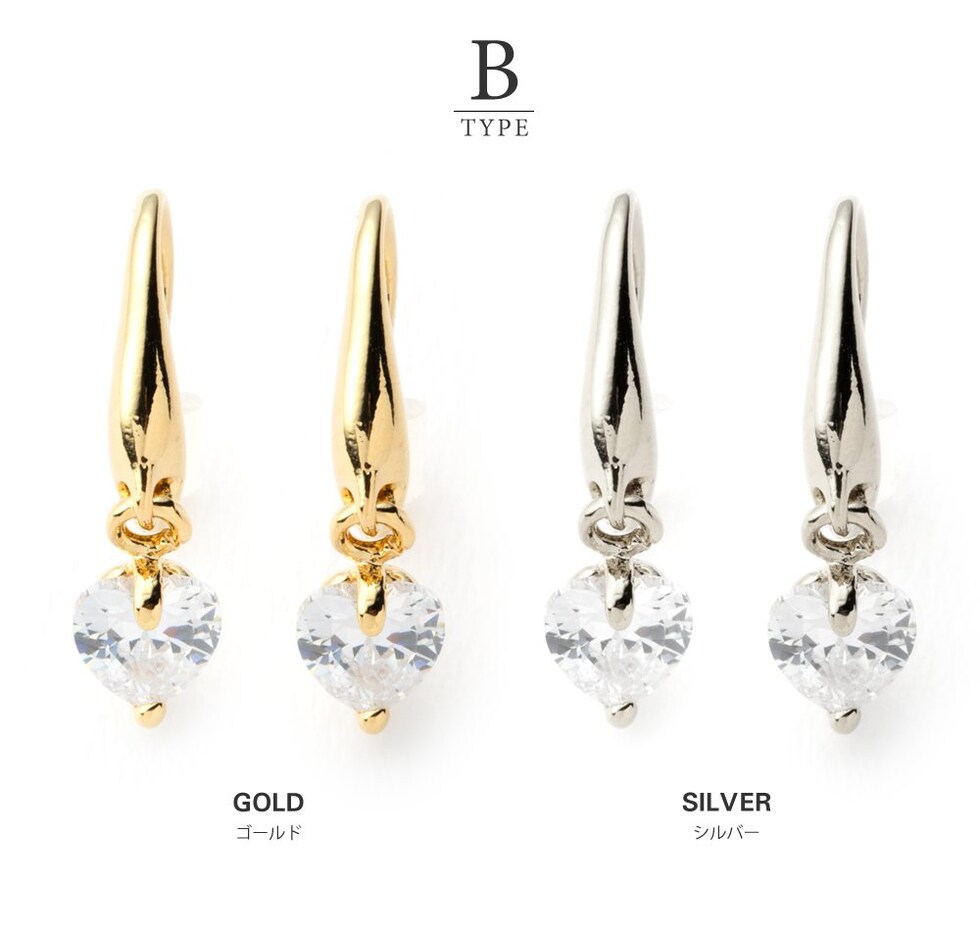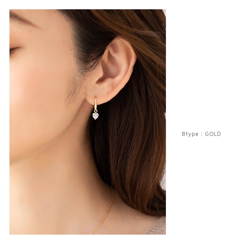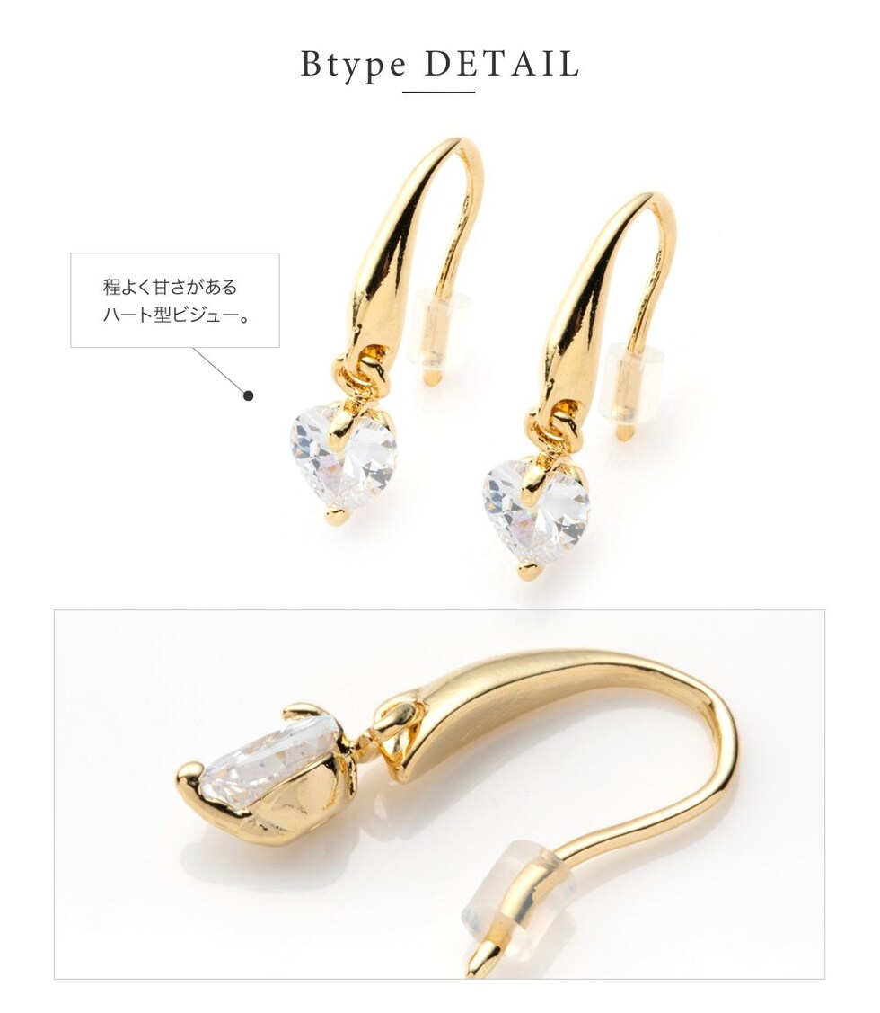 サークル、ハート、ひし形、ドロップの4種類のビジューを選べるフックピアス。