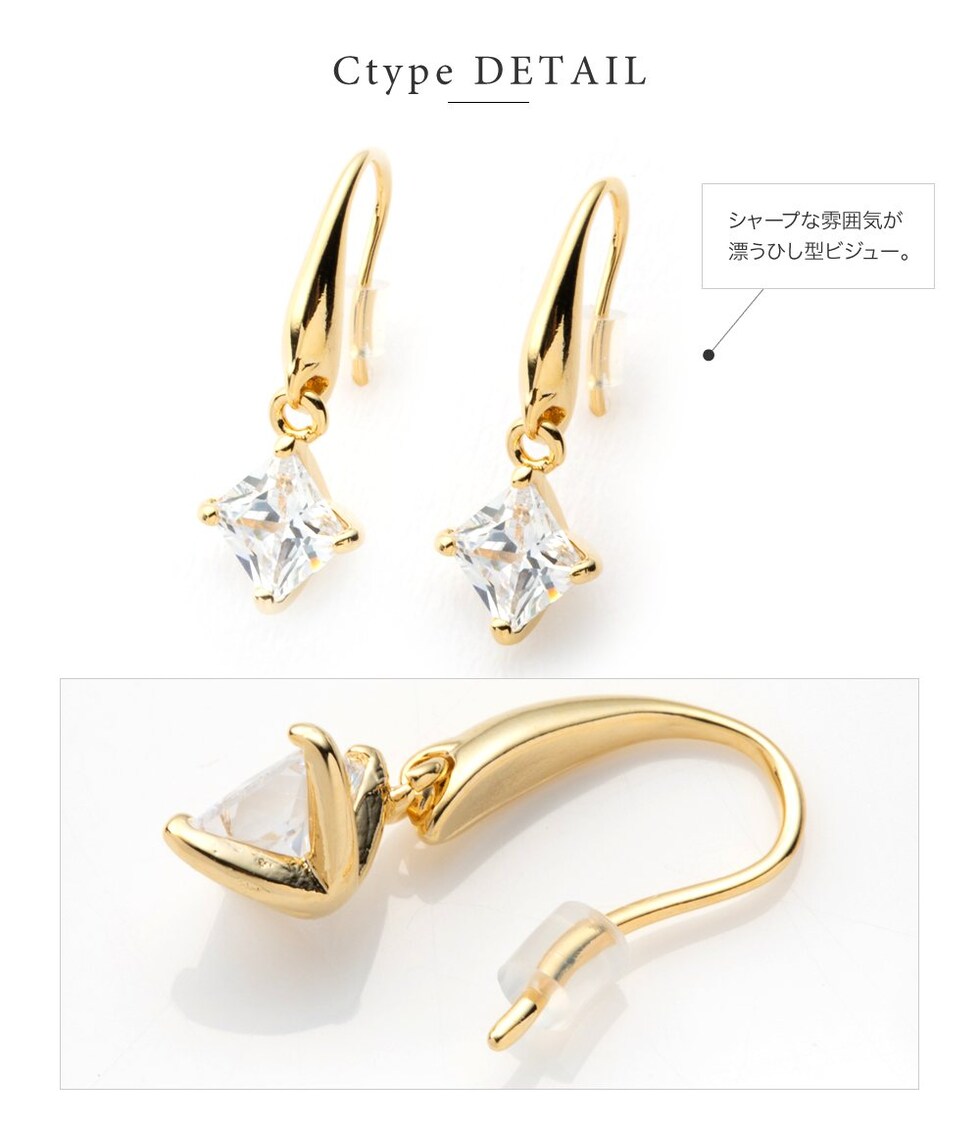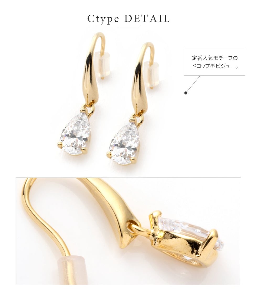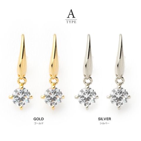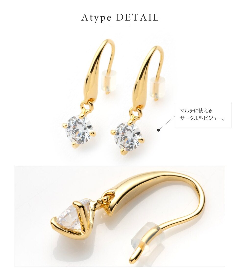 サークル、ハート、ひし形、ドロップの4種類のビジューを選べるフックピアス。