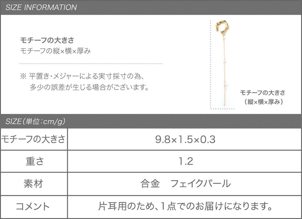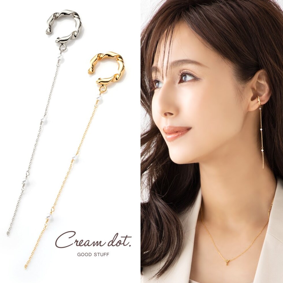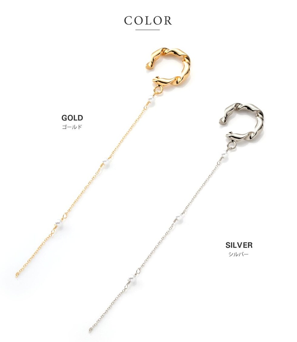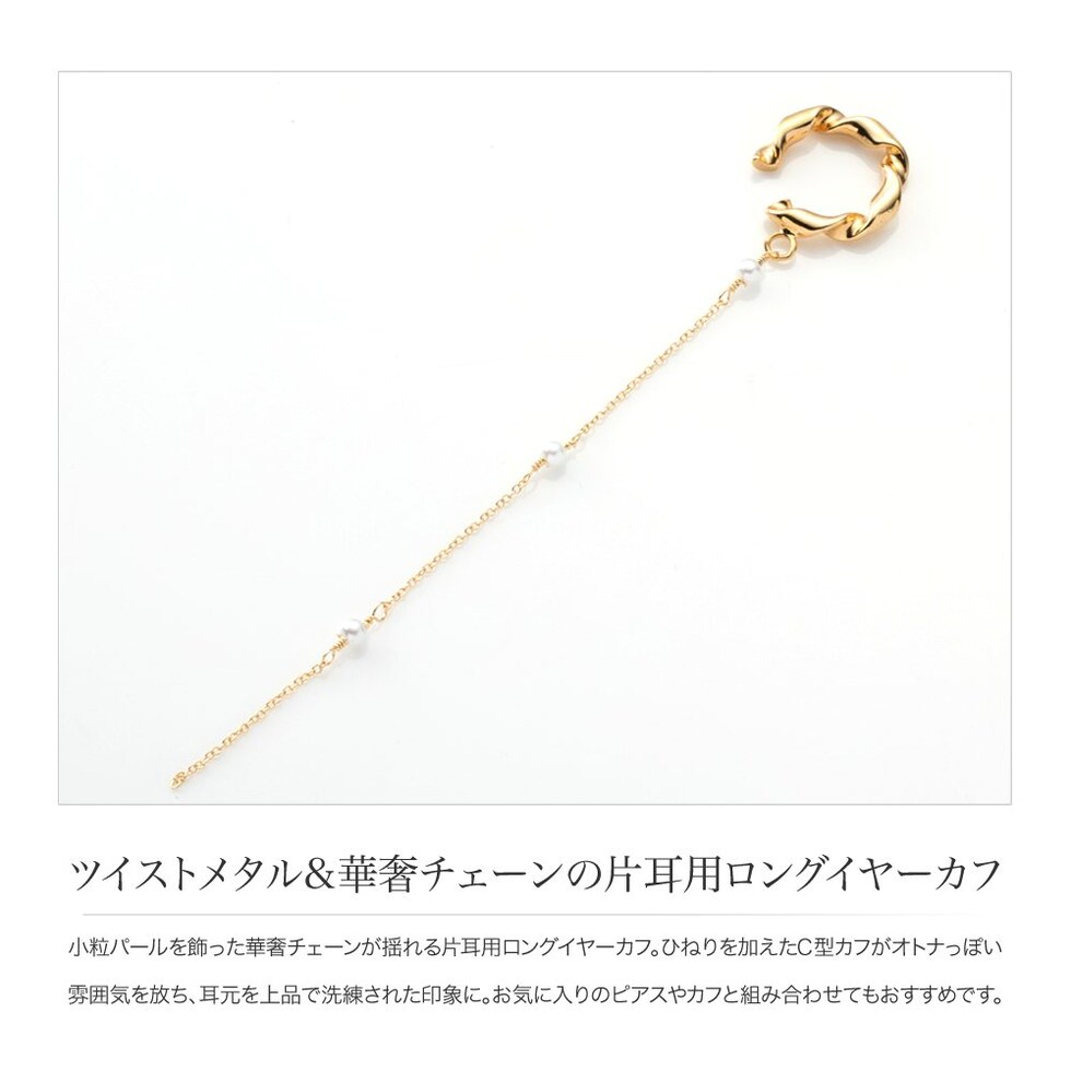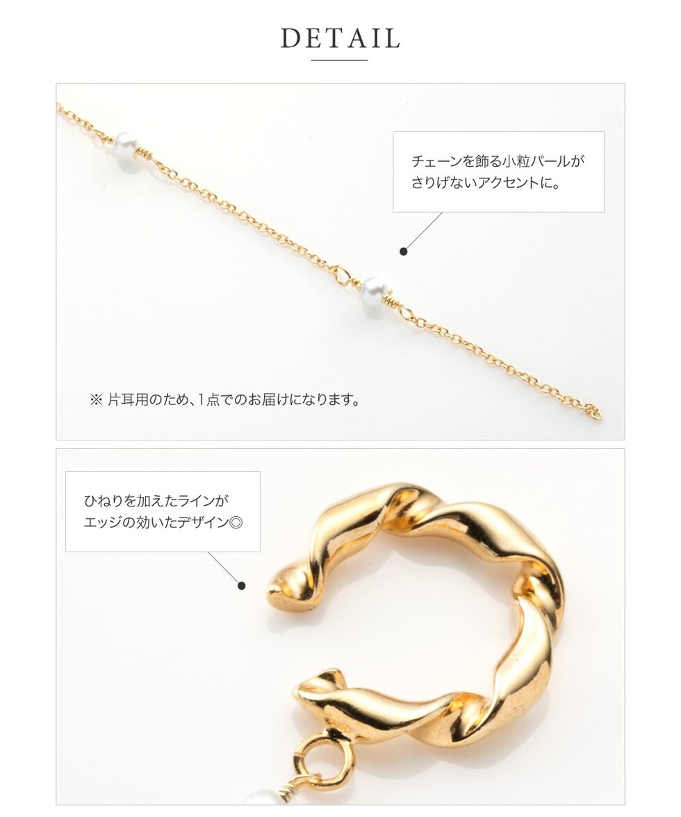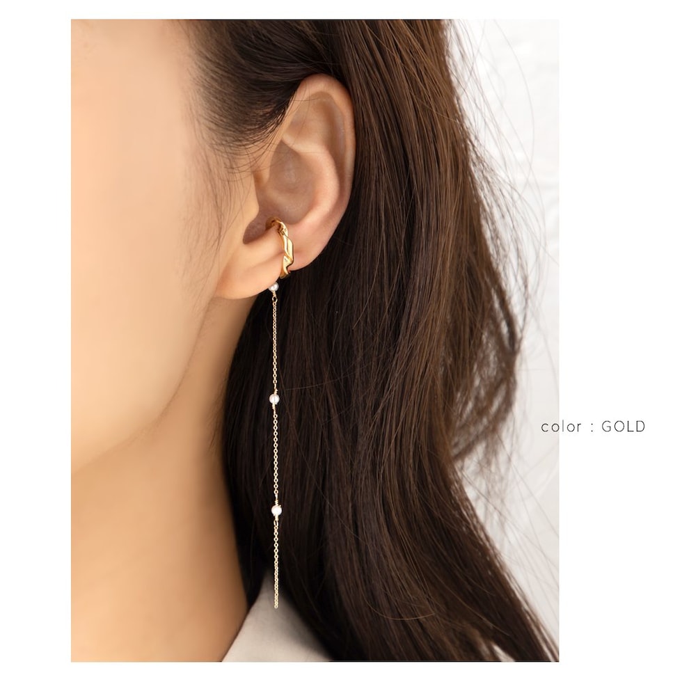 小粒パールを飾った華奢チェーンが揺れる片耳用ロングイヤーカフ。