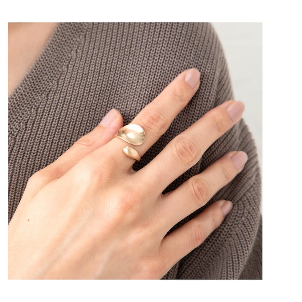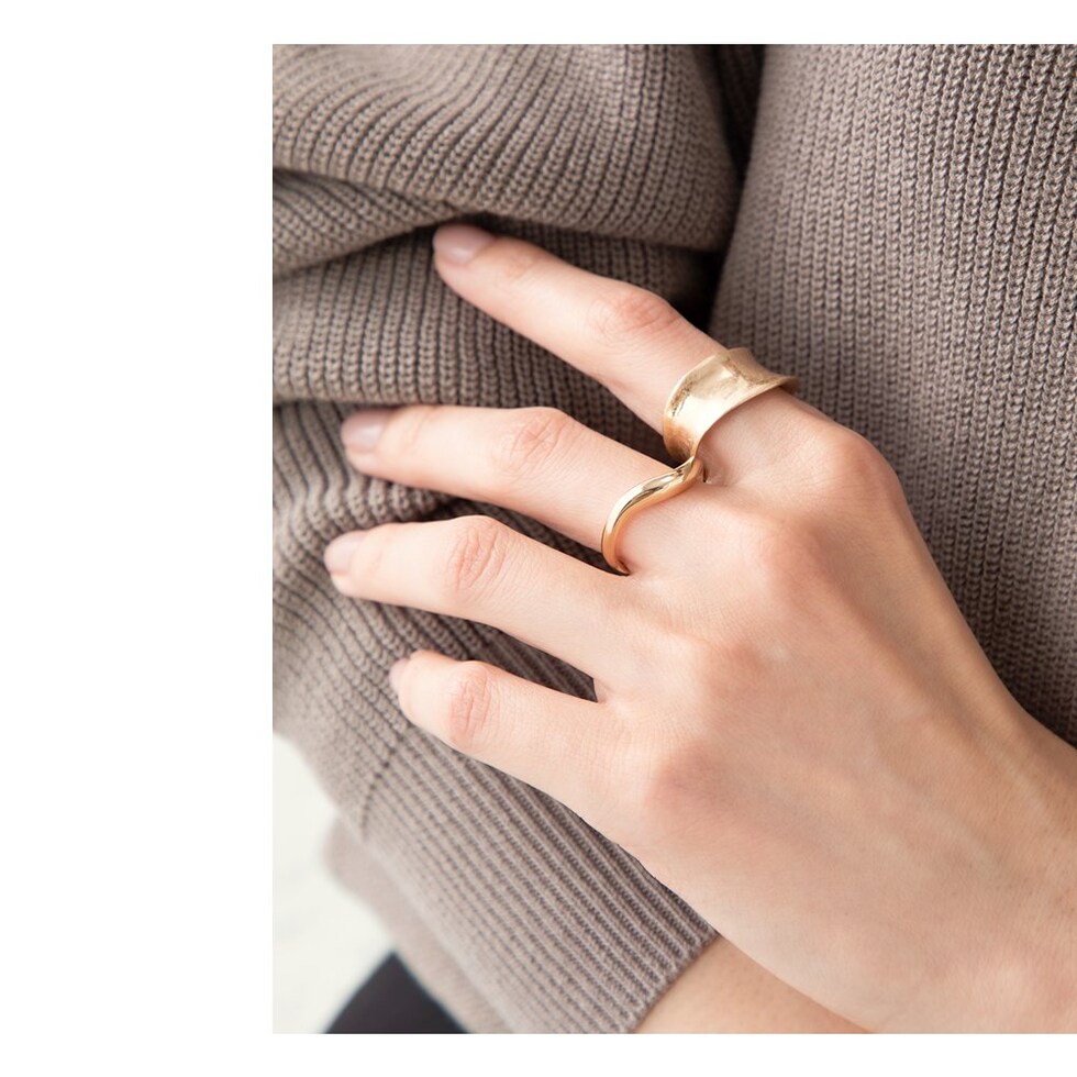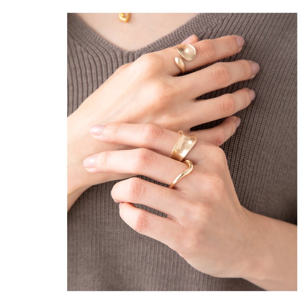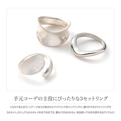 こなれて見えるヴィンテージ加工が施されたワイドリング&ラップリングと、緩やかでなVラインリングの3点セット。