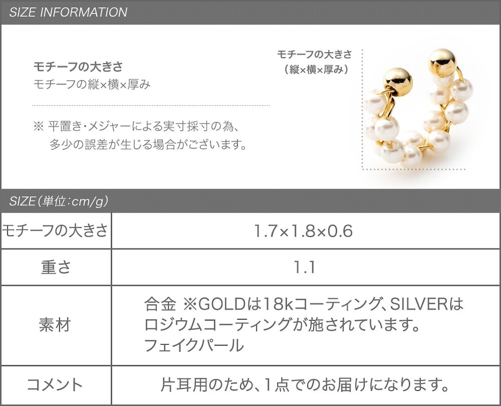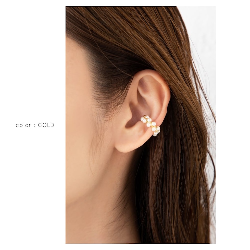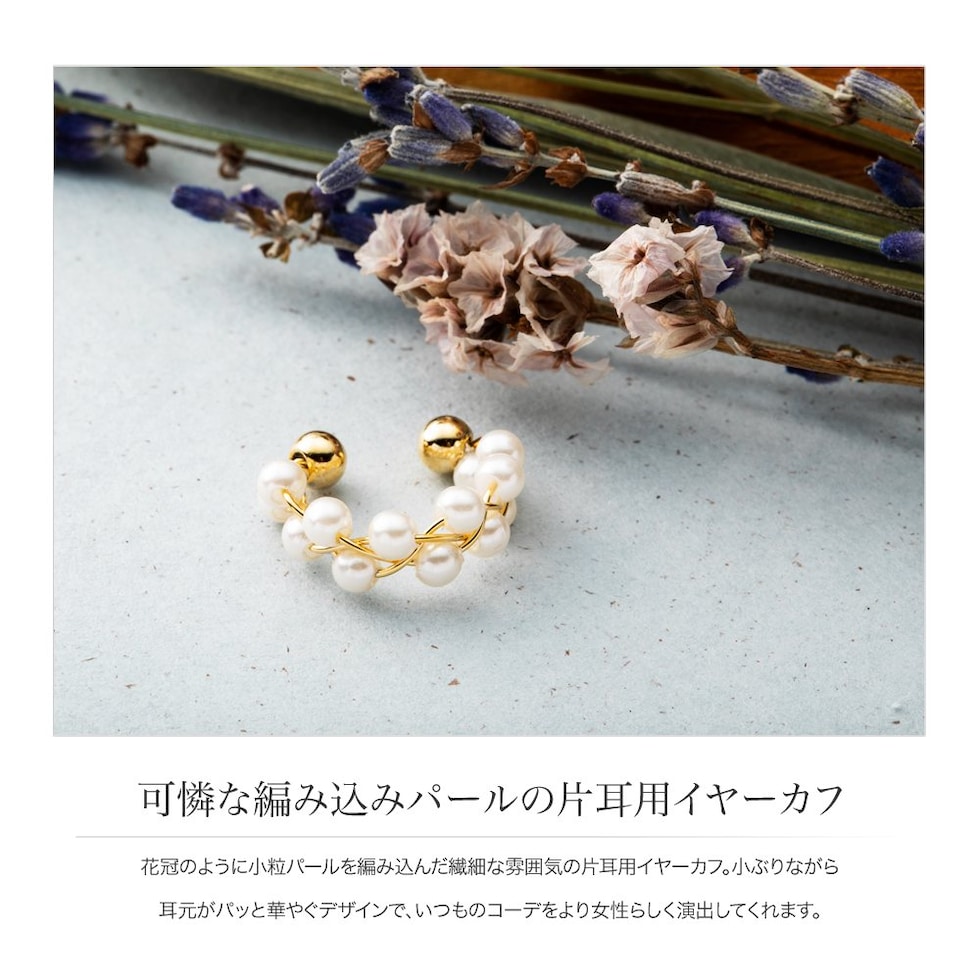 花冠のように小粒パールを編み込んだ繊細な雰囲気の片耳用イヤーカフ。