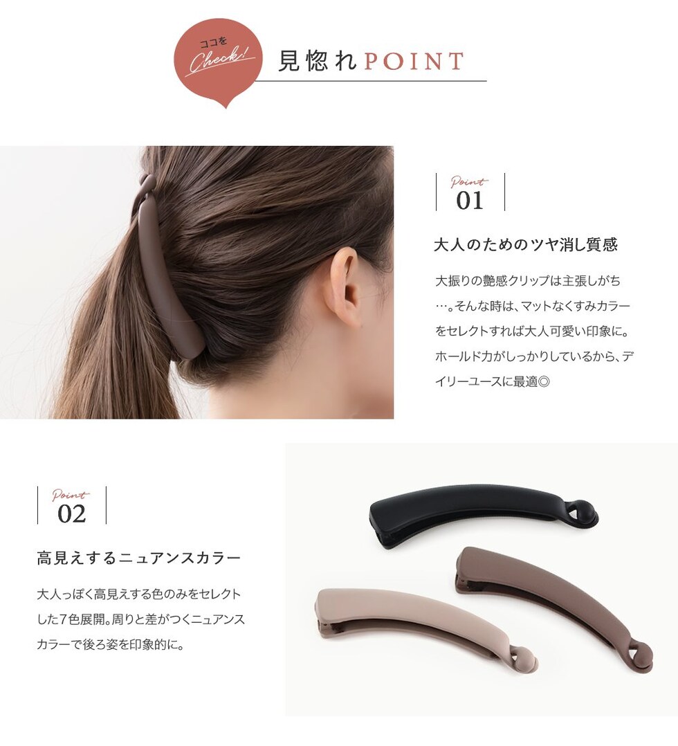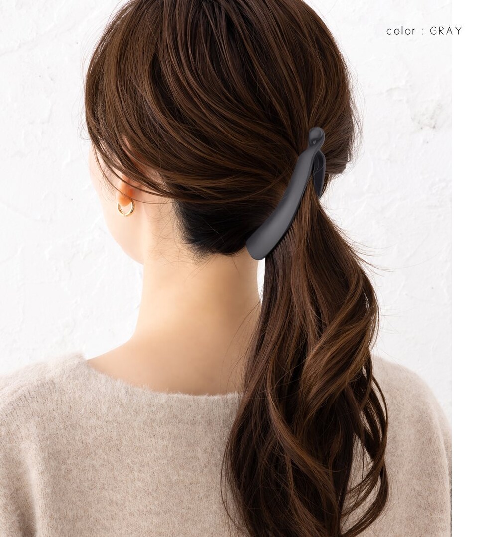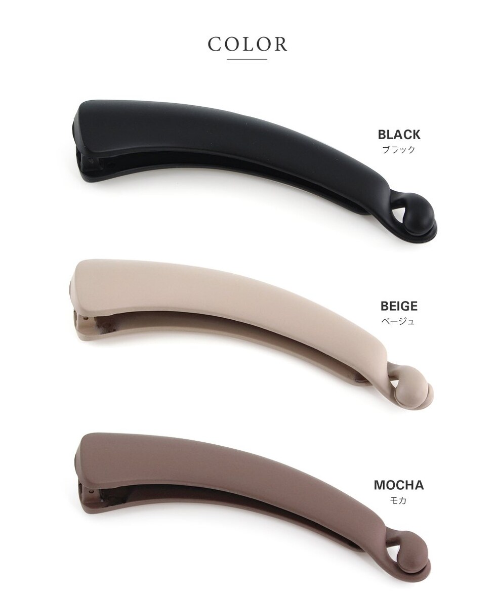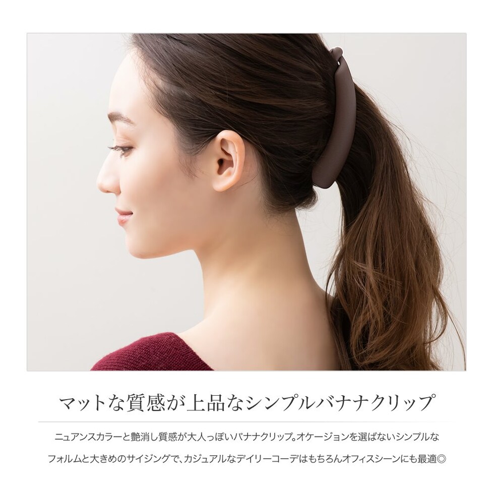 ニュアンスカラーと艶消し質感が大人っぽいバナナクリップ。オケージョンを選ばないシンプルなフォルムと大きめのサイジングで、カジュアルなデイリーコーデはもちろんオフィスシーンにも最適◎
