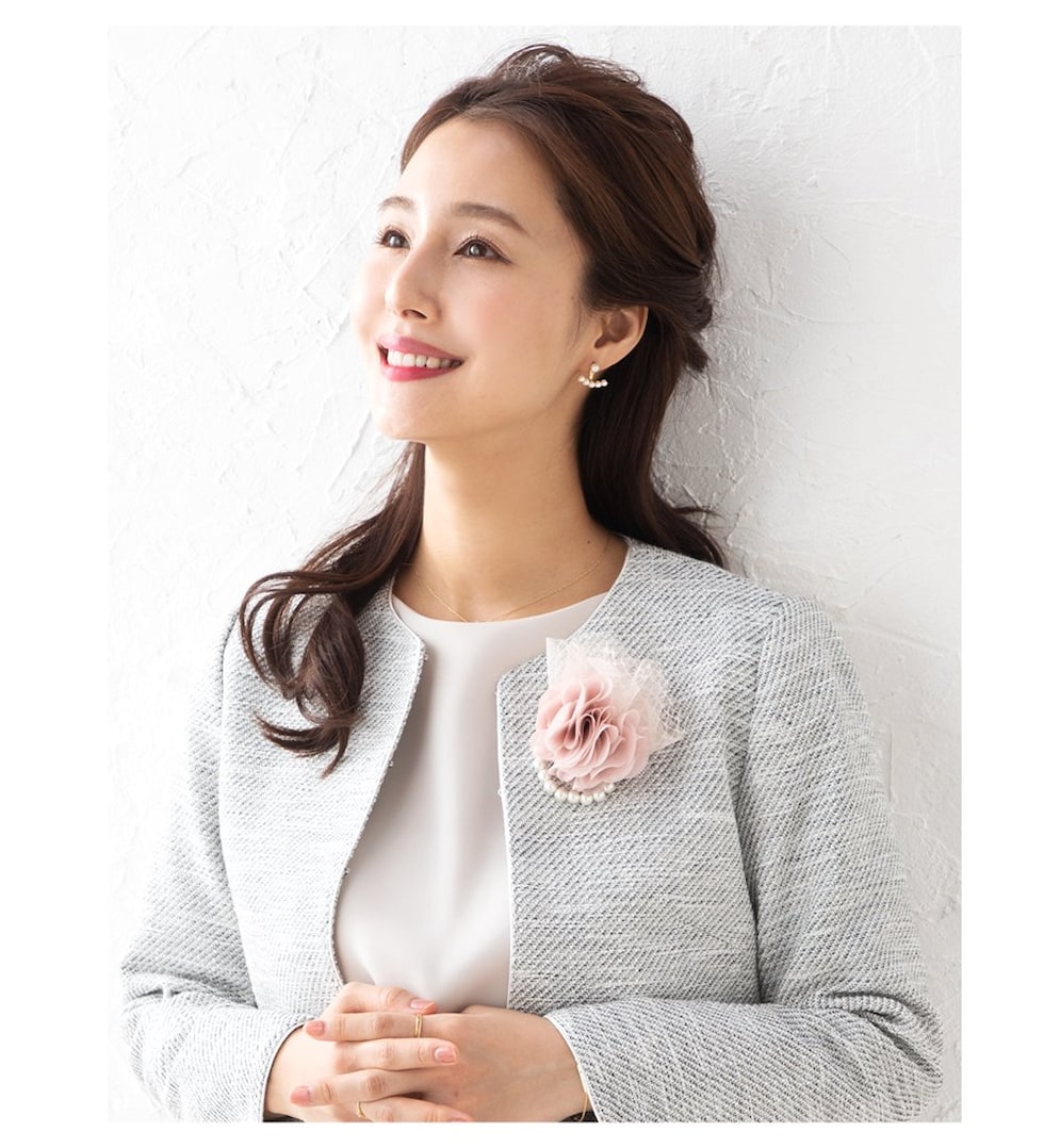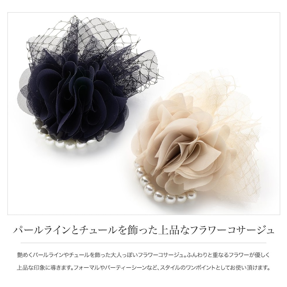 艶めくパールラインやチュールを飾った大人っぽいフラワーコサージュ。